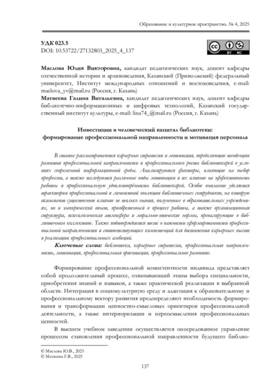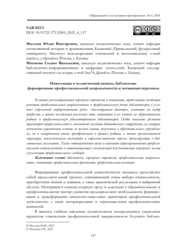 В статье рассматриваются карьерные стратегии и мотивация, определяющие тенденции развития профессиональной направленности и профессионального роста библиотекарей в условиях современной информационной среды. Анализируются факторы, влияющие на выбор профессии, а также исследуются различные виды мотивации и их влияние на эффективность работы и профессиональную удовлетворённость библиотекарей. Особое внимание уделяется траектории профессиональной и личностной эволюции библиотечных сотрудников, на которую оказывают существенное влияние не только знания, полученные в образовательных учреждениях, но и эмпирический опыт, приобретенный в процессе работы, а также организационная структура, психологическая атмосфера и морально-этические нормы, превалирующие в библиотечном коллективе. Также подтверждается тезис о важности сформированности профессиональной направленности и соответствующих компетенций для достижения карьерных высот и реализации профессиональных амбиций.