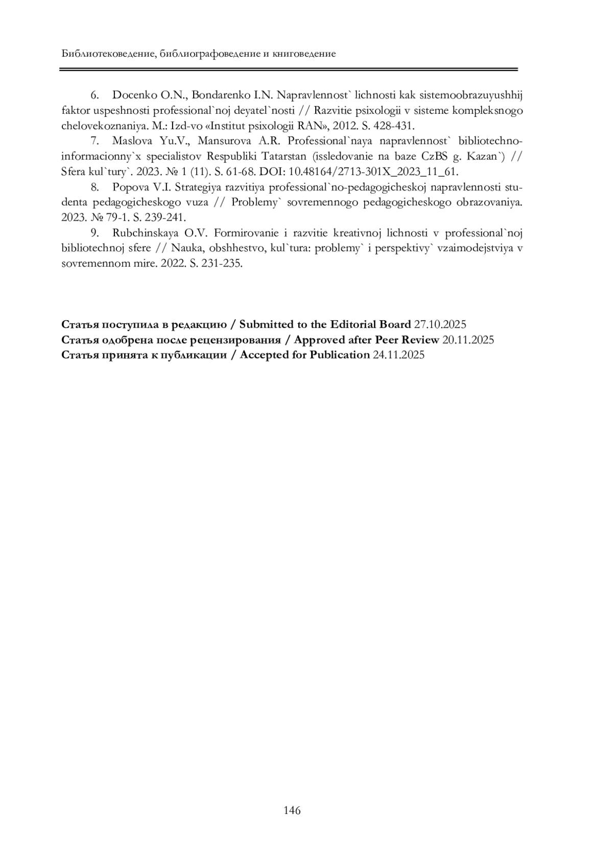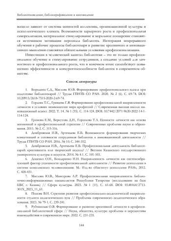 7. Маслова Ю.В., Мансурова А.Р. Профессиональная направленность библио течно-информационных специалистов Республики Татарстан (исследование на базе ЦБС г. Казань) // Сфера культуры. 2023. № 1 (11). С. 61-68. 10.48164/2713- 301X_2023_11_61. DOI: 10.48164/2713-301X_2023_11_61 EDN: JGOHIR