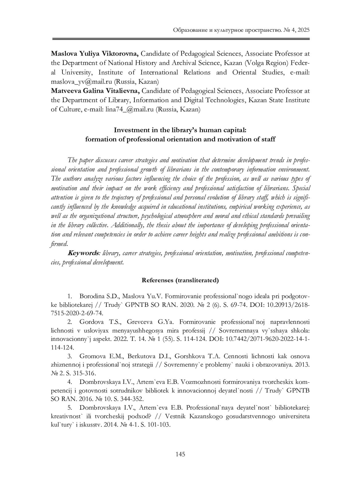 5. Домбровская И.В., Артемьева Е.Б. Профессиональная деятельность библиоте карей: креативность или творческий подход? // Вестник Казанского государственного университета культуры и искусств. 2014. № 4-1. С. 101-103. EDN: TNPYWV