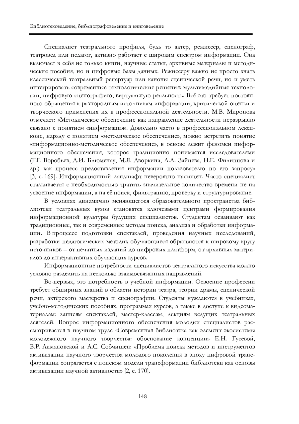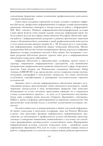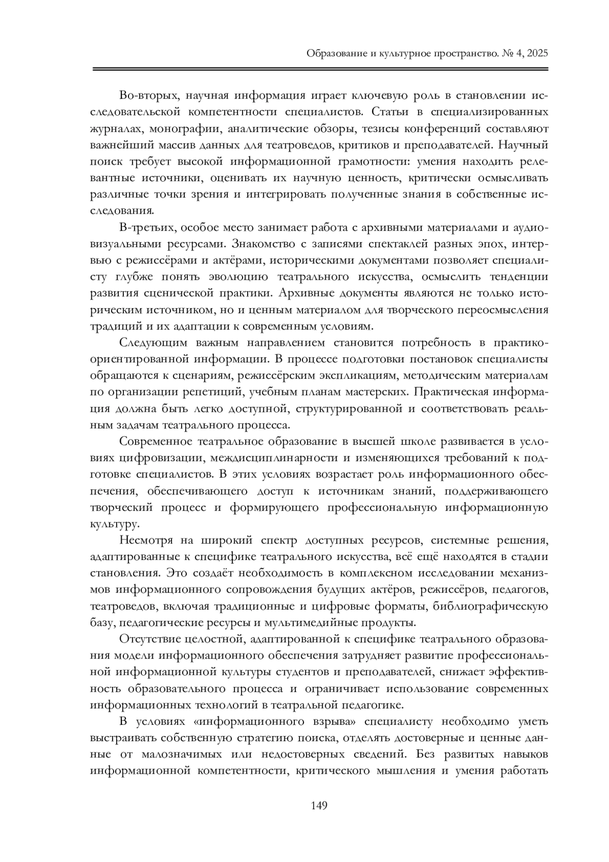 Специалист театрального профиля, будь то актёр, режиссёр, сценограф, театровед или педагог, активно работает с широким спектром информации. Она включает в себя не только книги, научные статьи, архивные материалы и методические пособия, но и цифровые базы данных. Режиссеру важно не просто знать классический театральный репертуар или каноны сценической речи, но и уметь интегрировать современные технологические решения: мультимедийные технологии, цифровую сценографию, виртуальную реальность. Всё это требует постоянного обращения к разнородным источникам информации, критической оценки и творческого применения их в профессиональной деятельности. М. В. Миронова отмечает: «Методическое обеспечение как направление деятельности неразрывно связано с понятием «информация». Довольно часто в профессиональном лексиконе, наряду с понятием «методическое обеспечение», можно встретить понятие «информационно-методическое обеспечение», в основе лежит феномен информационного обеспечения, которое традиционно понимается исследователями (Г. Г. Воробьев, Д. И. Блюменау, М. Я. Дворкина, Л. A. Зайцева, Н. Е. Филиппова и др.) как процесс предоставления информации пользователю по его запросу» [3, с. 169]. Информационный ландшафт невероятно насыщен. Часто специалист сталкивается с необходимостью тратить значительное количество времени не на усвоение информации, а на её поиск, фильтрацию, проверку и структурирование.