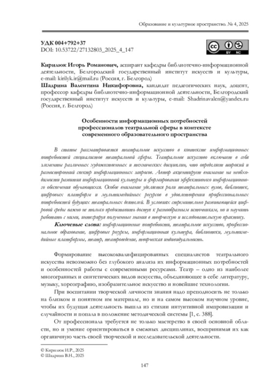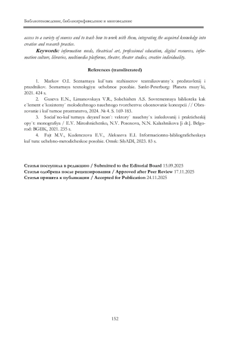 В статье рассматривается театральное искусство в контексте информационных потребностей специалистов театральной сферы. Театральное искусство включает в себя элементы различных художественных и технических дисциплин, что определяет широкий и разносторонний спектр информационных запросов. Автор акцентирует внимание на необходимости развития информационной культуры и формирования эффективного информационного обеспечения обучающихся. Особое внимание уделяется роли театральных вузов, библиотек, цифровых платформ и мультимедийных ресурсов в удовлетворении профессиональных потребностей будущих театральных деятелей. В условиях стремительно развивающейся цифровой среды важно не только предоставить доступ к разнообразным источникам, но и научить работать с ними, интегрируя полученные знания в творческую и исследовательскую практику.