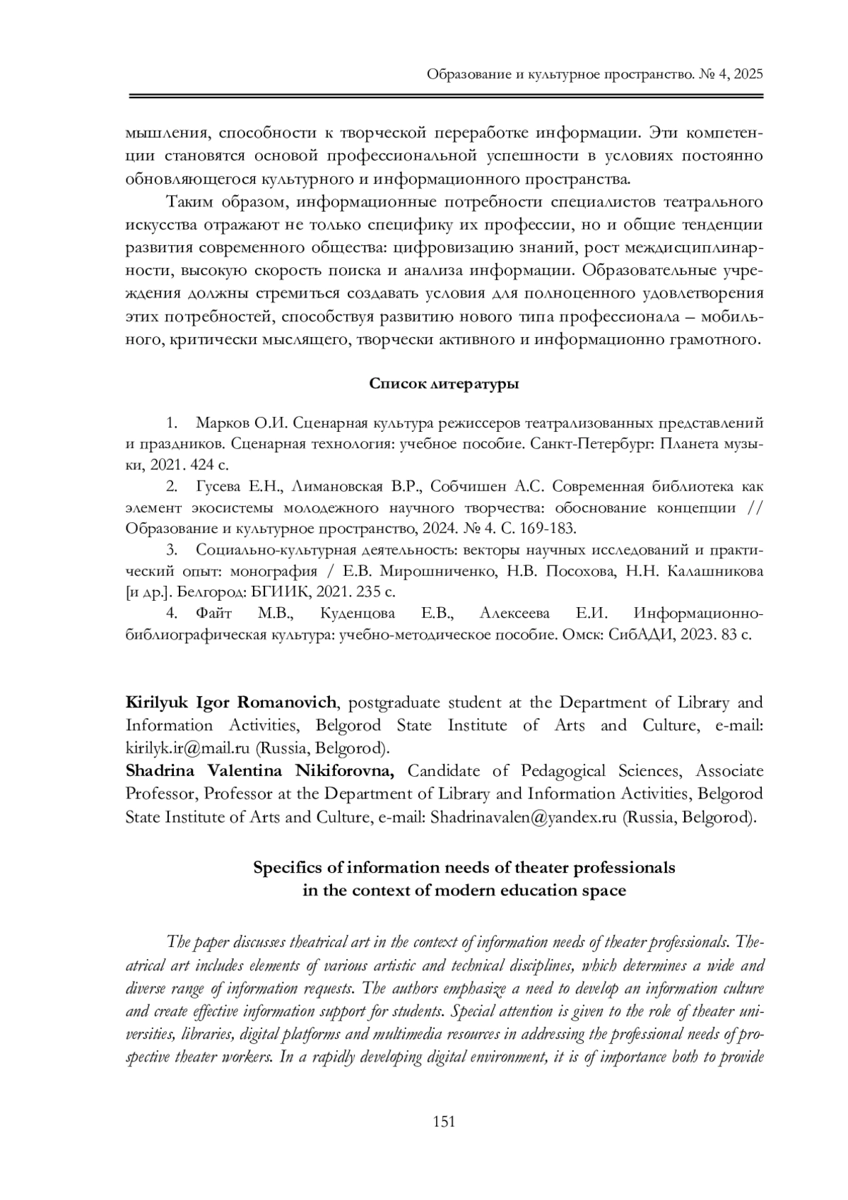 2. Гусева Е.Н., Лимановская В.Р., Собчишен А.С. Современная библиотека как элемент экосистемы молодежного научного творчества: обоснование концепции // Образование и культурное пространство, 2024. № 4. С. 169-183. EDN: DXAHDN