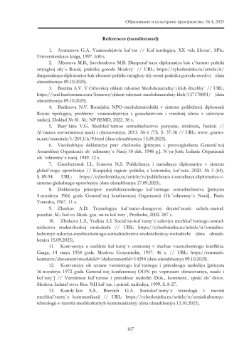 2. Алборова М.Б., Савченкова М.Б. Диаспоральная дипломатия как элемент политики “мягкой силы” России, практика города Москвы // URL: https://cyberleninka.ru/ article/n/diasporalnaya-diplomatiya-kak-element-politiki-myagkoy-sily-rossii-praktika-goroda moskvy (дата обращения 09.10.2025).
