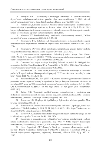10. Жукова Л.С., Юдина А.И. Социально-культурные условия межкультурного сотрудничества студенческой молодежи // URL: https://cyberleninka.ru/article/n/sotsialno kulturnyeusloviya-mezhkulturnogo-sotrudnichestva-studencheskoy-molodezhi (дата обраще ния 15.09.2025).