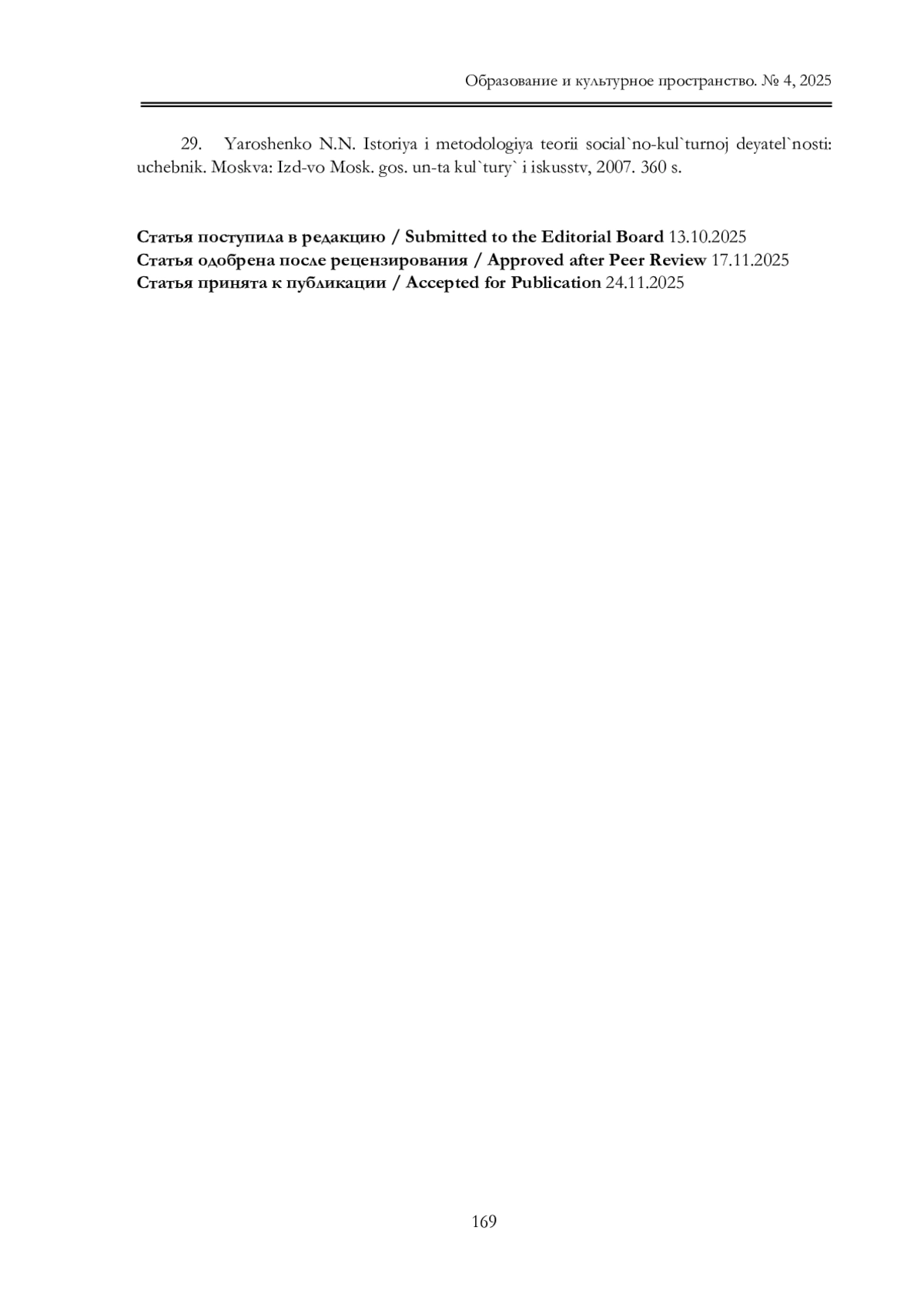 29. Ярошенко Н.Н. История и методология теории социально-культурной деятельности: учебник. Москва: Изд-во Моск. гос. ун-та культуры и искусств, 2007. 360 с. EDN: QOIRVX