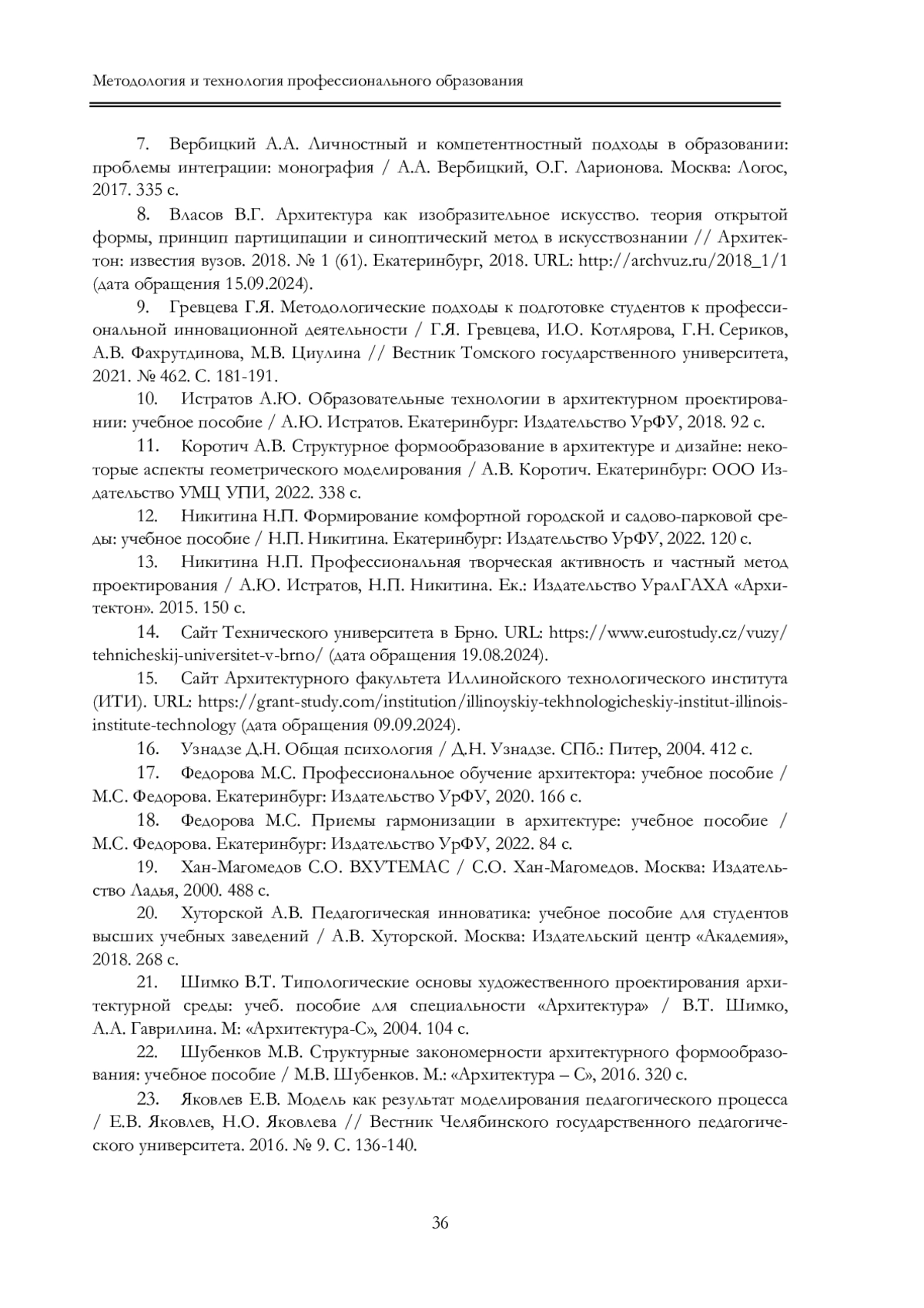 17. Федорова М.С. Профессиональное обучение архитектора: учебное пособие / М.С. Федорова. Екатеринбург: Издательство УрФУ, 2020. 166 с.