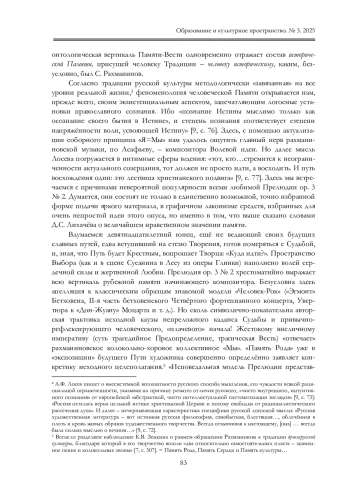 В статье осуществляется попытка осветить творчество С. В. Рахманинова с точки зрения присущего композитору обострённого выражения концепта Памяти, обусловленного, как доказывается в статье, спецификой рубежной эпохи - времени жизни и творчества композитора. Показывается важность этого универсального концепта человеческой жизни и культуры, способного проникать в самые глубины человеческого бытия, и особенно в заповедную область творчества. Представлен опыт строительства онтологической вертикали Памяти-Вести, обнимающей все уровни духовного бытия человека, утверждается представление об экзистенциальной природе Памяти. Рассматривается участие разных аспектов Памяти в музыке Рахманинова. Использование мифолого-символического подхода позволяет исследователю обозначить сущностные этапы творческого пути С. В. Рахманинова, показав всю глубину их концептуального наполнения.
