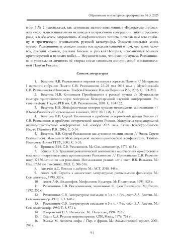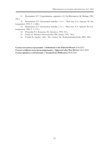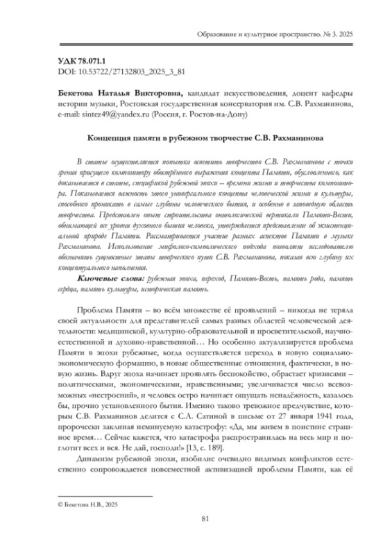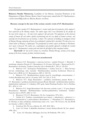 1. Бекетова Н.В. Рахманинов и мировая культура в зеркалах Памяти // Материалы I научного собрания Памяти С.В. Рахманинова 23-24 мая 2014 года / Музей-усадьба С.В. Рахманинова “Ивановка”. Тамбов-Ивановка: Изд-во Першина Р.В., 2015. С. 194-210. EDN: HCCDUS