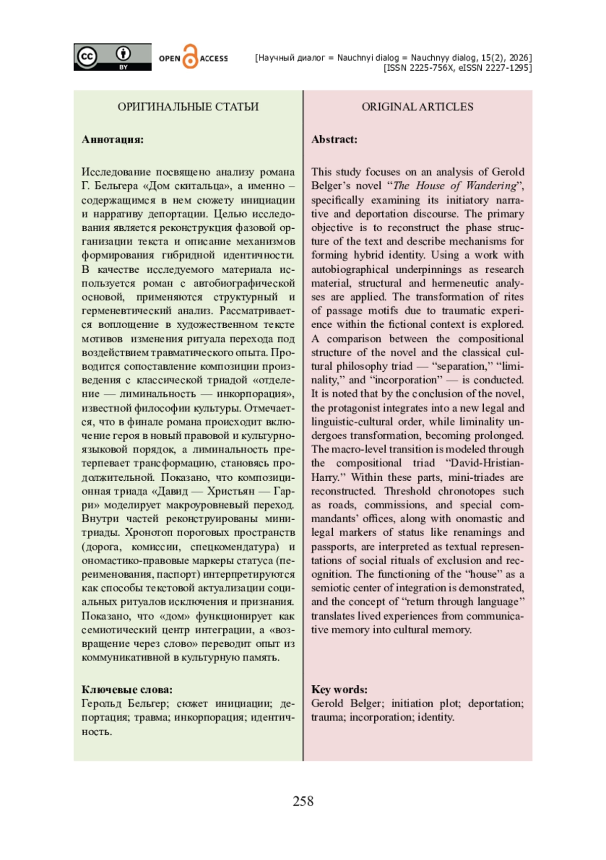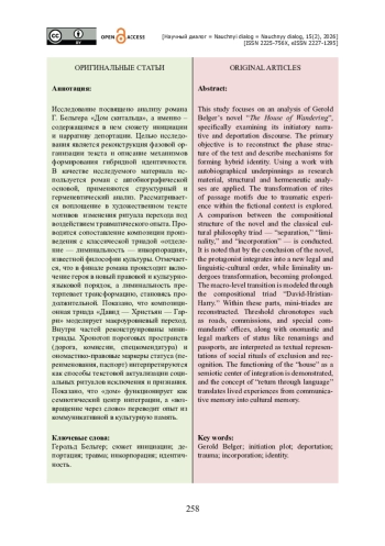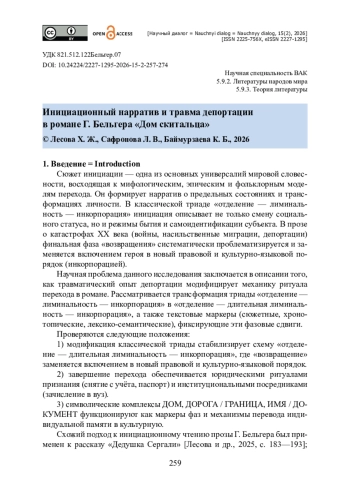 Исследование посвящено анализу романа Г. Бельгера «Дом скитальца», а именно – содержащимся в нем сюжету инициации и нарративу депортации. Целью исследования является реконструкция фазовой организации текста и описание механизмов формирования гибридной идентичности. В качестве исследуемого материала используется роман с автобиографической основой, применяются структурный и герменевтический анализ. Рассматривается воплощение в художественном тексте мотивов изменения ритуала перехода под воздействием травматического опыта. Проводится сопоставление композиции произведения с классической триадой «отделение — лиминальность — инкорпорация», известной философии культуры. Отмечается, что в финале романа происходит включение героя в новый правовой и культурно-языковой порядок, а лиминальность претерпевает трансформацию, становясь продолжительной. Показано, что композиционная триада «Давид — Христьян — Гарри» моделирует макроуровневый переход. Внутри частей реконструированы мини-триады. Хронотоп пороговых пространств (дорога, комиссии, спецкомендатура) и ономастико-правовые маркеры статуса (переименования, паспорт) интерпретируются как способы текстовой актуализации социальных ритуалов исключения и признания. Показано, что «дом» функционирует как семиотический центр интеграции, а «возвращение через слово» переводит опыт из коммуникативной в культурную память.