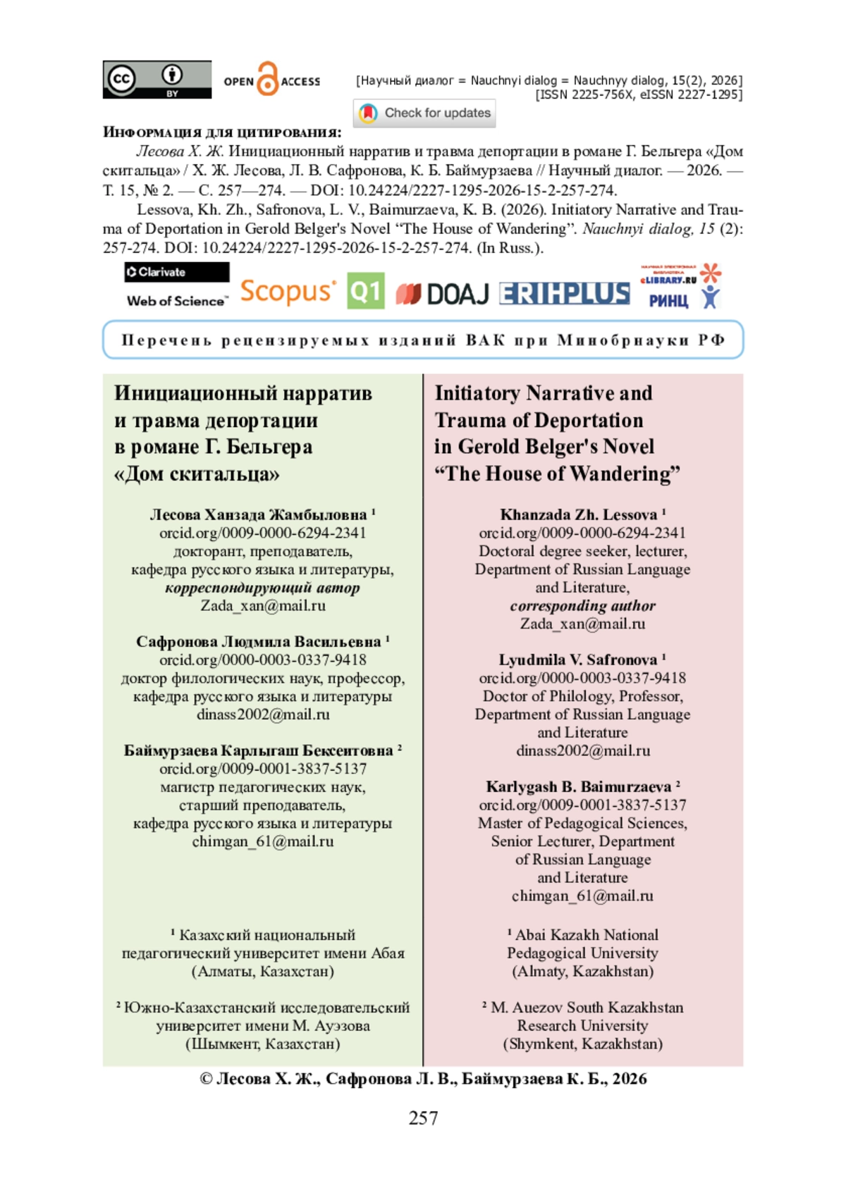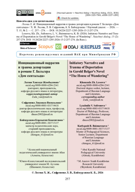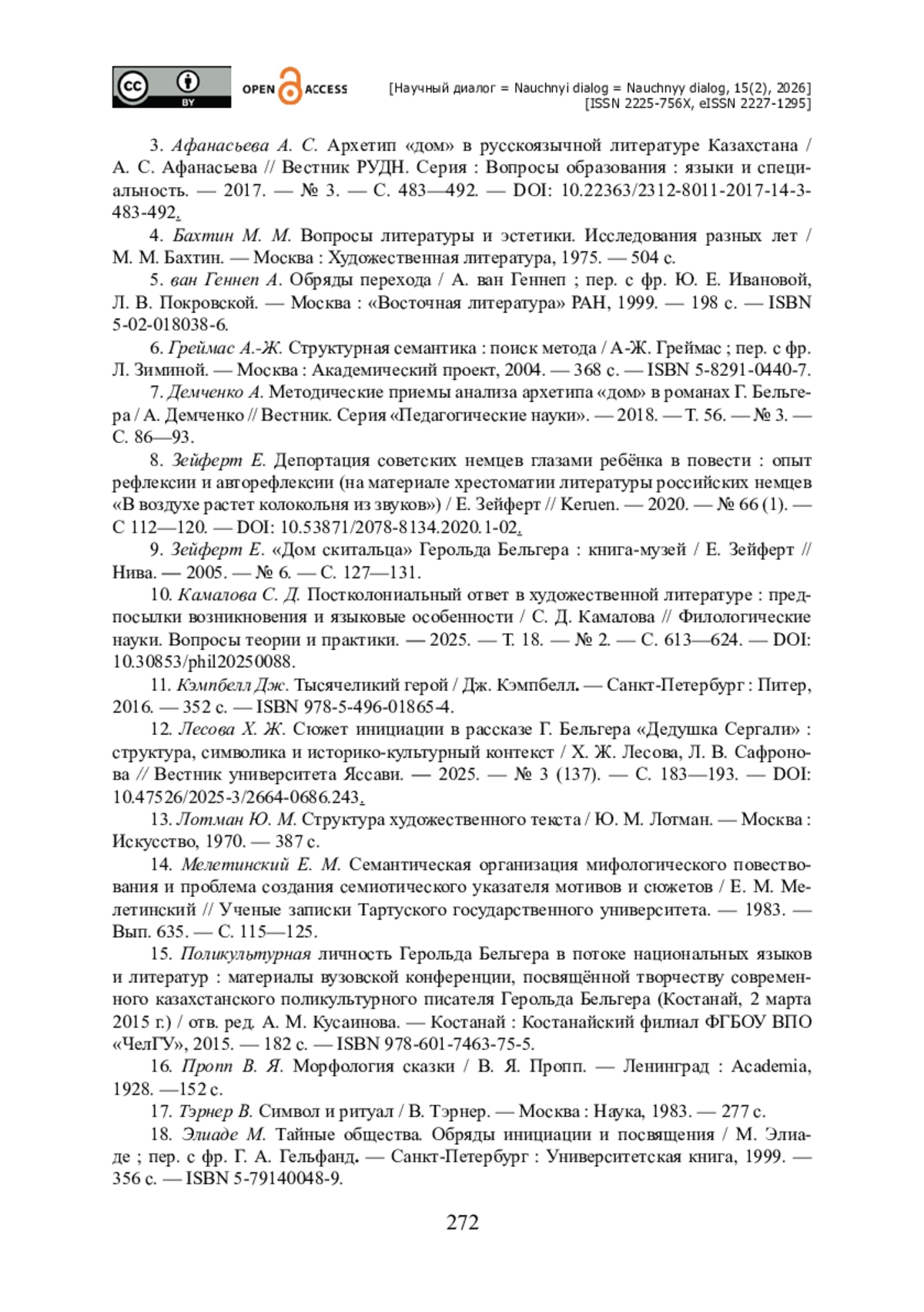 12. Лесова Х. Ж. Сюжет инициации в рассказе Г. Бельгера «Дедушка Сергали» : структура, символика и историко-культурный контекст / Х. Ж. Лесова, Л. В. Сафронова // Вестник университета Яссави. - 2025. - № 3 (137). - С. 183-193. - https://doi.org/10.47526/2025-3/2664-0686.243.