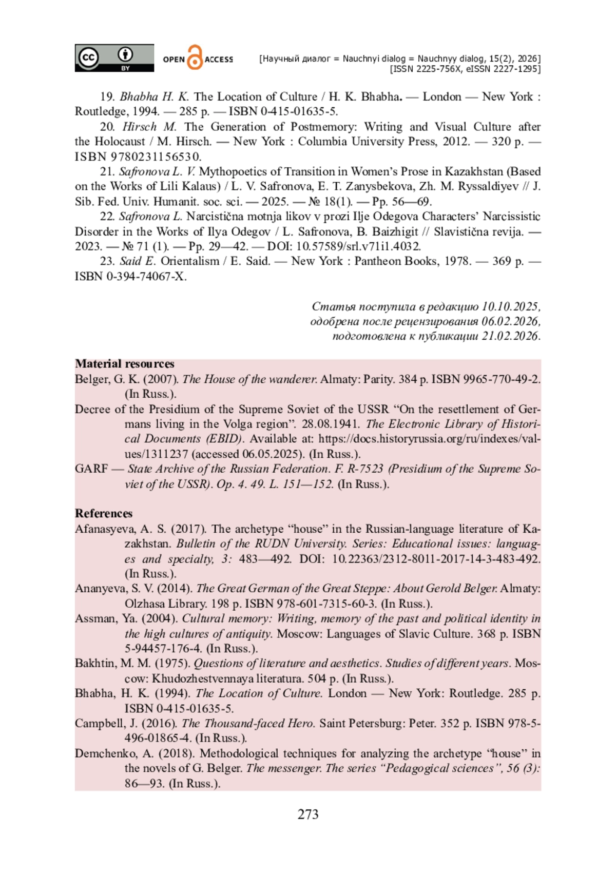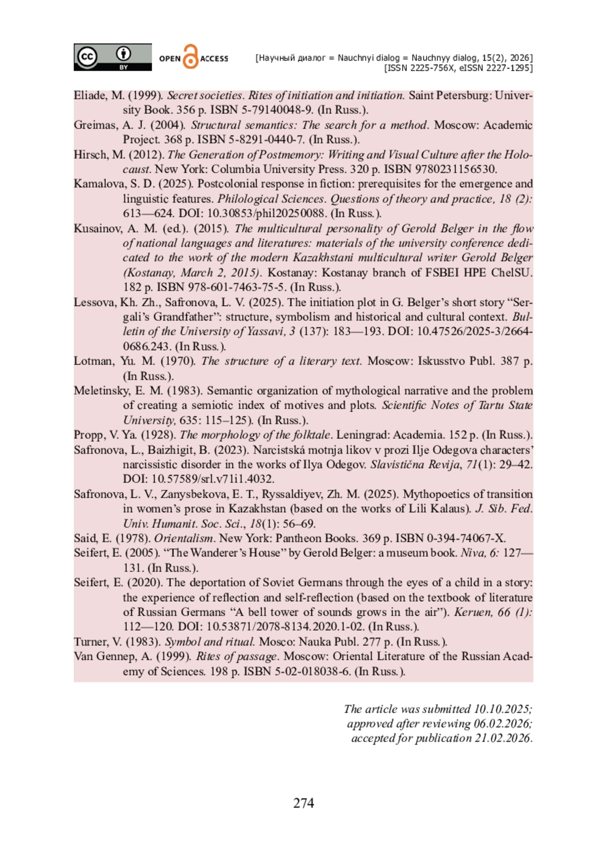 21. Safronova L. V. Mythopoetics of Transition in Women’s Prose in Kazakhstan (Based on the Works of Lili Kalaus) / L. V. Safronova, E. T. Zanysbekova, Zh. M. Ryssaldiyev // J. Sib. Fed. Univ. Humanit. soc. sci. - 2025. - № 18(1). - Pp. 56-69.