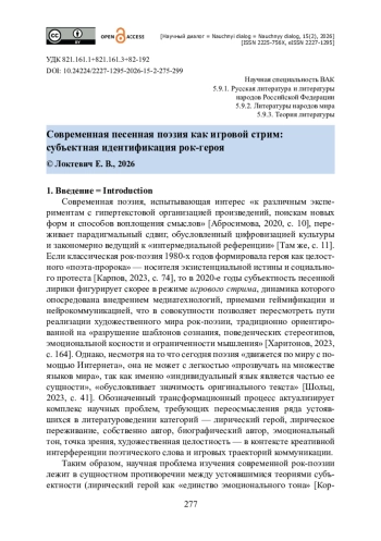 В статье рассматривается специфика субъектной организации современной белорусской и российской рок-поэзии, опосредованной актуальными игровыми стратегиями. Особое внимание автор уделяет осмыслению проблемы (само)идентификации лирического субъекта в условиях фиджитализации, медиатизации и геймификации культуры. Представлены результаты компаративистского анализа вербальных субтекстов творчества музыкальных групп «Vihilija», «Няміга», «Bjarla» и «Хрен» за 2021—2025 годы. Поднимается вопрос о роли автокоммуникации и полифонических конструкций в оформлении имиджа игрового субъекта сознания и речи как преемника ролевого героя. Верификационный акцент делается на определении воздействия стратегий стриминговых коммуникаций и компьютерной игровой эстетики на рок-поэтику. Актуальность исследования обусловлена необходимостью научного осмысления связей трансформации субъектной организации рок-текста и кризиса традиционных форм субъектности. Вводятся понятия игрового рок-стрима, автокоммуникативного игрового кода, внесубъектного героя-игрока. Доказано, что рок-герой эволюционирует от монологического «Я-пророка» к модулируемой игровой проекции. Предлагается классификация игровых стратегий лирического субъекта: аватарная, нарративно-ролевая, автокоммуникативная, трансмедийная. Выполнен обзор репрезентации Своего / Другого / Чужого сознания в фокусе экзистенциально-виртуального художественного бытия.