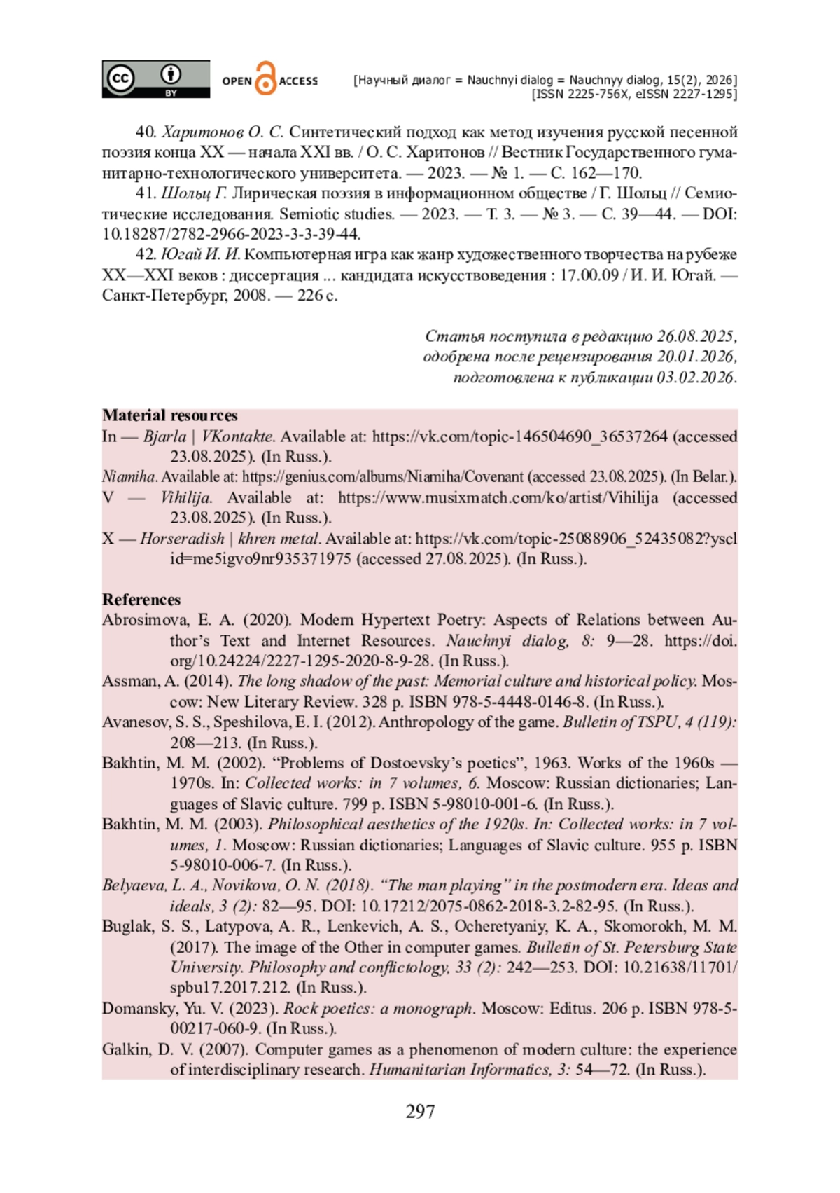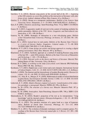 39. Харитонов О. С. Синтетический подход как метод изучения русской песенной поэзия конца XX - начала XXI вв. / О. С. Харитонов // Вестник Государственного гуманитарно-технологического университета. - 2023. - № 1. - С. 162-170.
