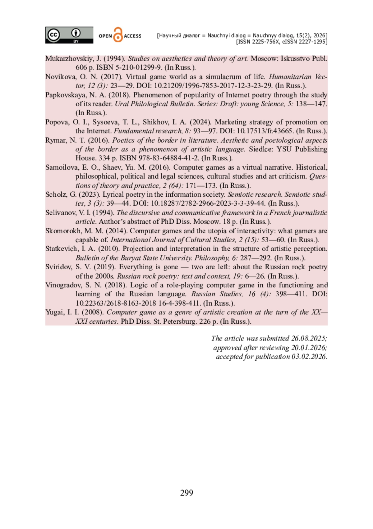 1. Абросимова Е. А. Современная гипертекстовая поэзия : аспекты взаимодействия авторского текста и интернет-медиа / Е. А. Абросимова // Научный диалог. - 2020. - № 8. - С. 9-28. - https://doi.org/10.24224/2227-1295-2020-8-9-28.