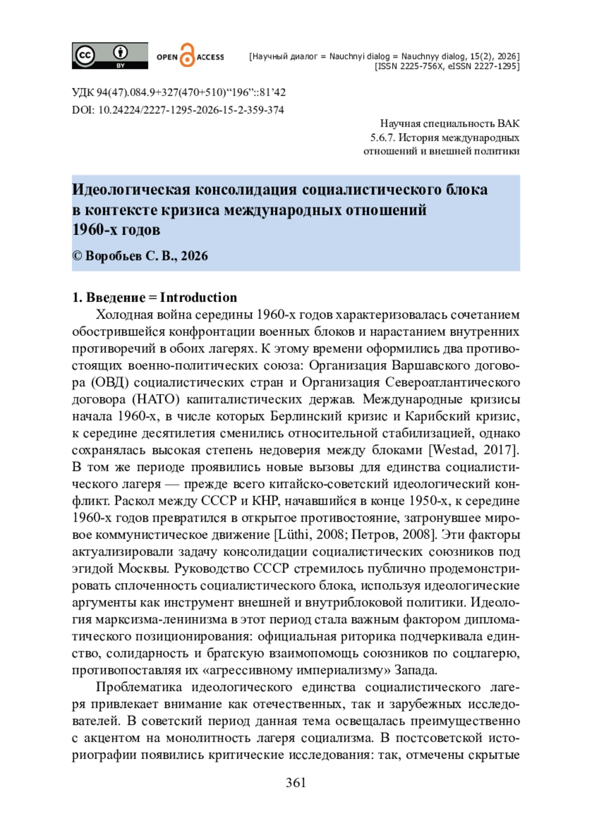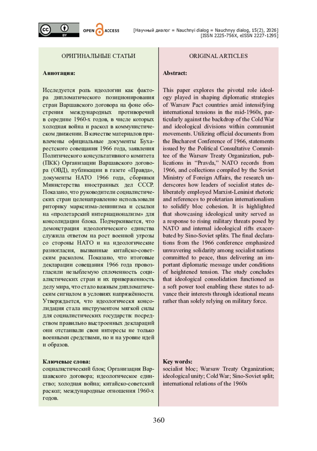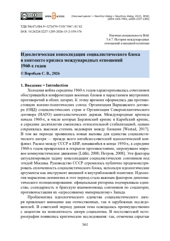 Исследуется роль идеологии как фактора дипломатического позиционирования стран Варшавского договора на фоне обострения международных противоречий в середине 1960-х годов, в числе которых холодная война и раскол в коммунистическом движении. В качестве материалов привлечены официальные документы Бухарестского совещания 1966 года, заявления Политического консультативного комитета (ПКК) Организации Варшавского договора (ОВД), публикации в газете «Правда», документы НАТО 1966 года, сборники Министерства иностранных дел СССР. Показано, что руководители социалистических стран целенаправленно использовали риторику марксизма-ленинизма и ссылки на «пролетарский интернационализм» для консолидации блока. Подчеркивается, что демонстрация идеологического единства служила ответом на рост военной угрозы со стороны НАТО и на идеологические разногласия, вызванные китайско-советским расколом. Показано, что итоговые декларации совещания 1966 года провозгласили незыблемую сплоченность социалистических стран и их приверженность делу мира, что стало важным дипломатическим сигналом в условиях напряжённости. Утверждается, что идеологическя консолидация стала инструментом мягкой силы для социалистических государств: посредством правильно выстроенных деклараций они отстаивали свои интересы не только военными средствами, но и на уровне идей и образов.