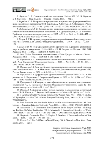 3. Барский К. М. К вопросу о формировании современной китайской дипломатической школы / К. М. Барский // Российское китаеведение. - 2023. - № 1 (2). - С. 100-116. - https://doi.org/10.48647/ICCA.2023.71.25.005.
