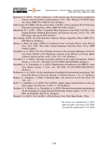 9. Егорова Н. И. «Народная дипломатия» ядерного века : движение сторонников мира и проблема разоружения, 1955-1965 гг. / Н. И. Егорова. - Москва : ИВИ РАН; Аквилон, 2016. - 320 с. - ISBN 978-5-906578-19-8.