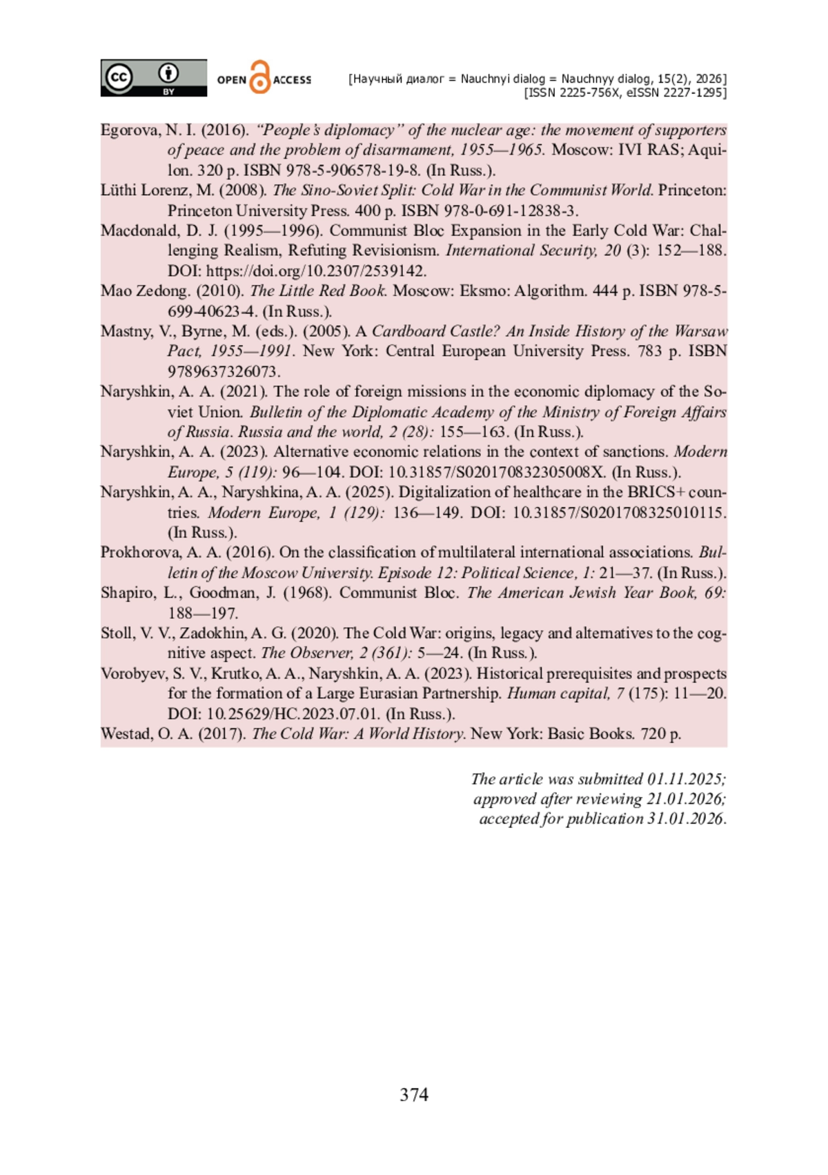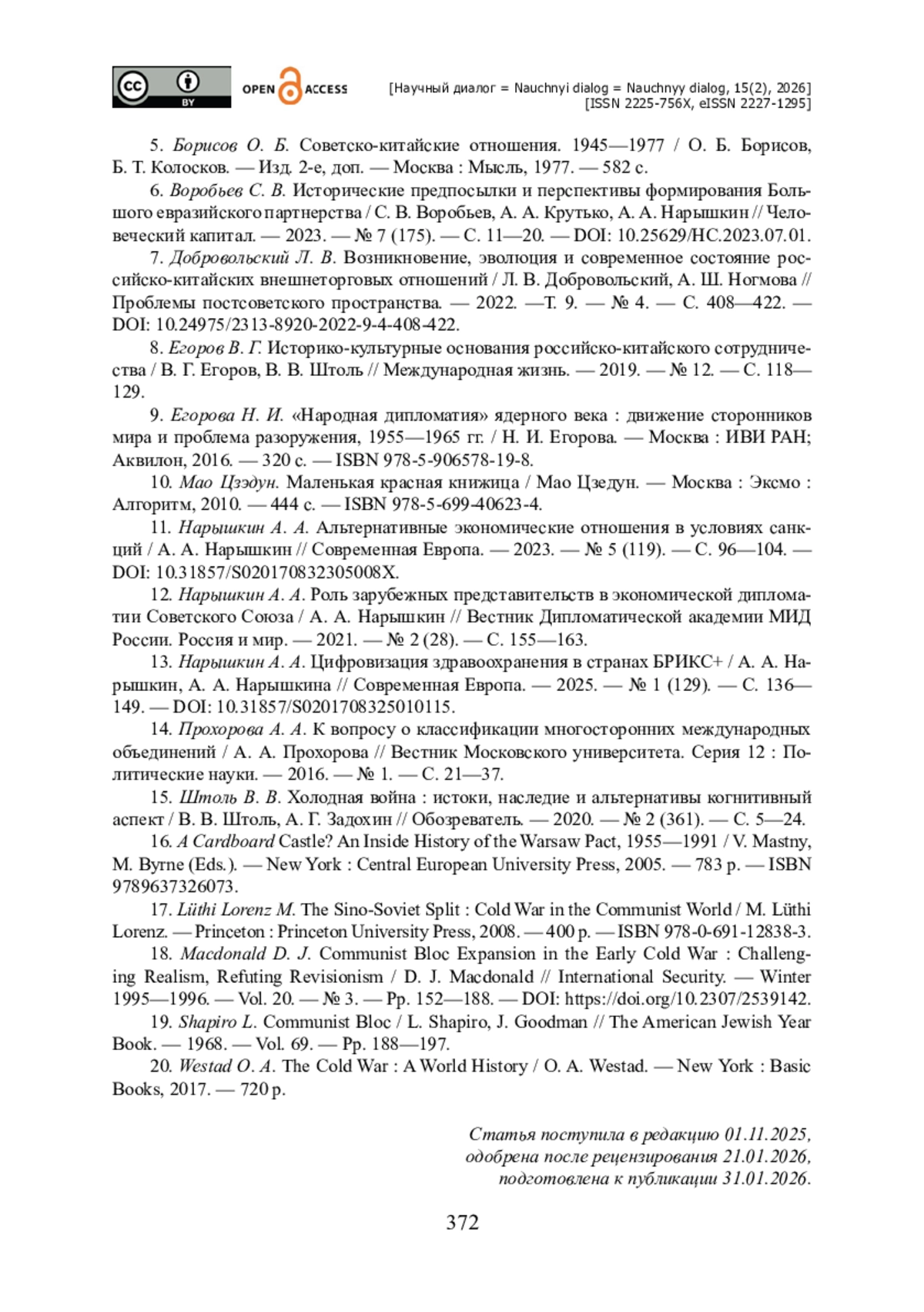 15. Штоль В. В. Холодная война : истоки, наследие и альтернативы когнитивный аспект / В. В. Штоль, А. Г. Задохин // Обозреватель. - 2020. - № 2 (361). - С. 5-24.
