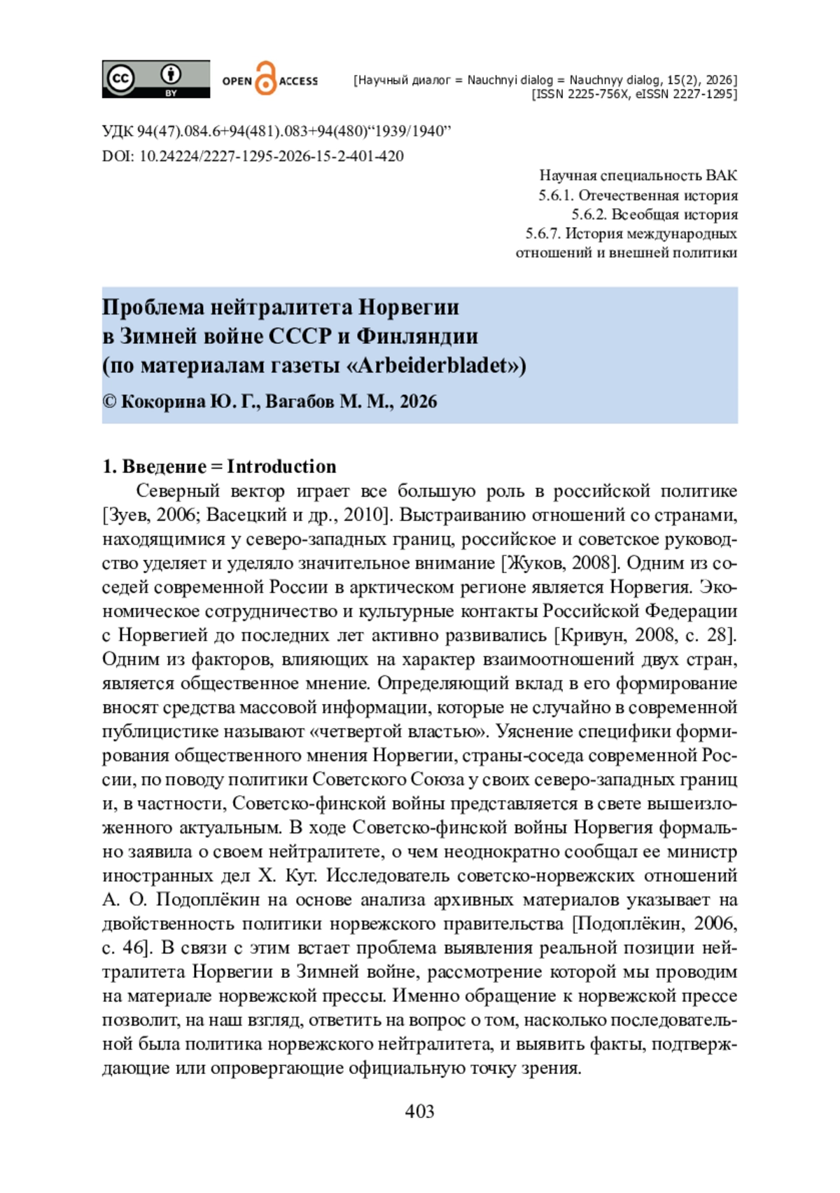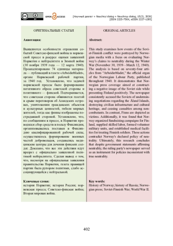 Выявляются особенности отражения событий Советско-финской войны в норвежской прессе в ракурсе оценки заявлений Норвегии о нейтралитете в Зимней войне (30 ноября 1939 года — 12 марта 1940). Проанализировано 74 единицы материала — публикаций в газете «Arbeiderbladet», органе Норвежской рабочей партии, за 1940 год. Установлено, что задачей норвежской прессы было формирование негативного образа советской стороны и позитивного — финской. Подчеркивается, что советская сторона обвиняется газетой в срыве переговоров об Аландских островах, уничтожении гражданских объектов и культурных ценностей, гибели мирных жителей, тогда как финны изображены пострадавшей стороной. Установлено, что, по сообщениям в прессе, в Норвегии проводился сбор средств в пользу Финляндии, организовывались поставки в Финляндию квалифицированной рабочей силы, осуществлялось формирование военных частей добровольцев, создавались медицинские центры для лечения финских солдат. Доказано, что все эти действия идут вразрез с официально заявленной политикой нейтралитета. Сделан вывод о том, что, несмотря на официальные заявления правительства Норвегии, газета правящей партии была рупором политики, слабо ассоциирующейся с нейтральной.