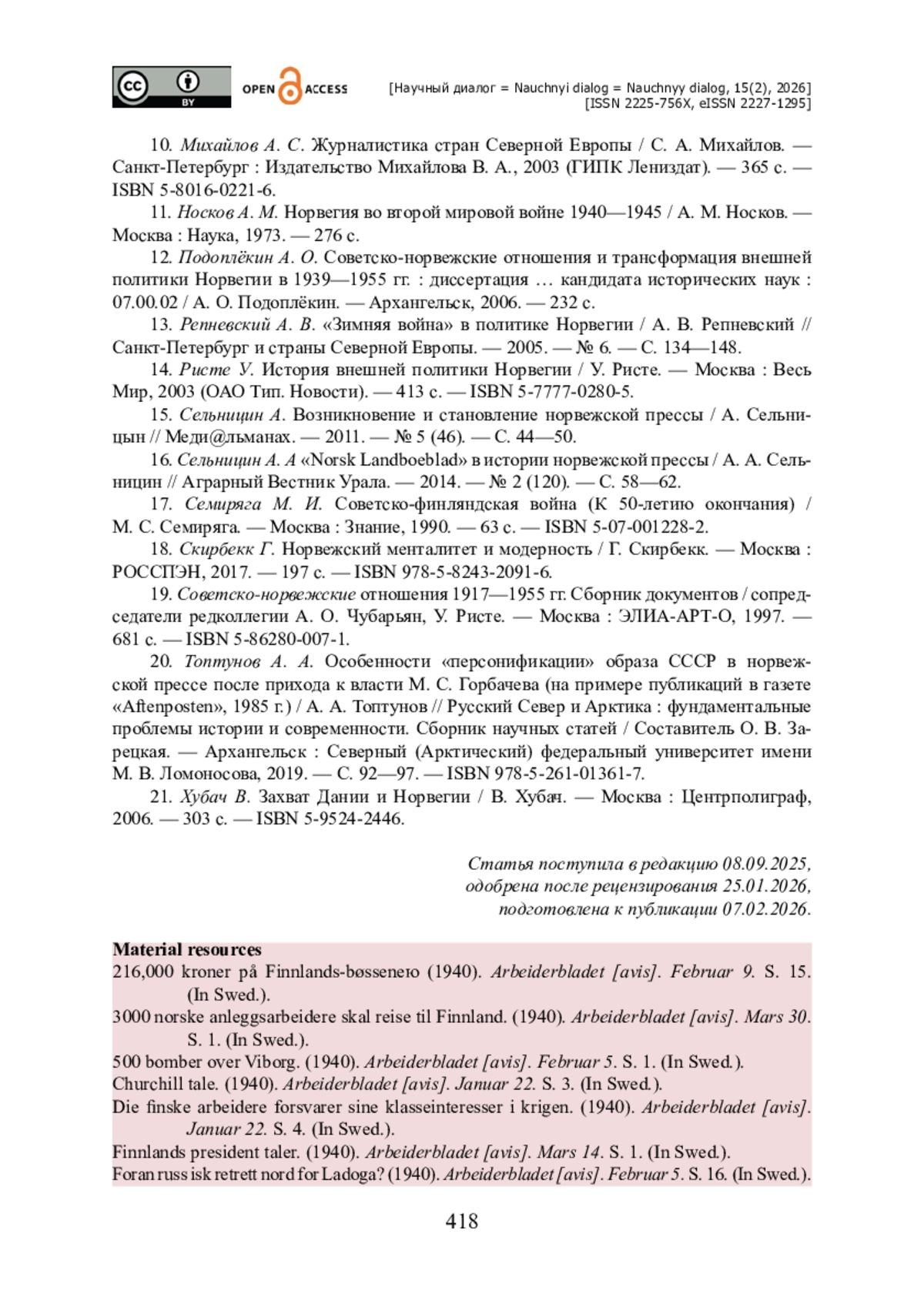 15. Сельницин А. Возникновение и становление норвежской прессы / А. Сельницын // Меди@льманах. - 2011. - № 5 (46). - С. 44-50.