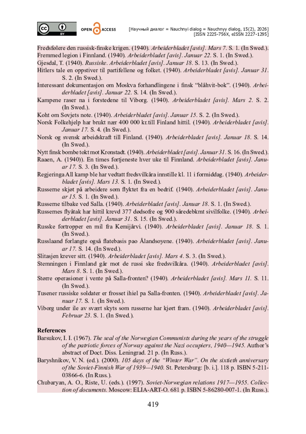 «Arbeiderbladet» публикует ноту Советского Правительства и ответ Правительства Норвегии, с комментариями о том, что в своей ноте CCCP «среди конкретных претензий указаны случаи публикации призывов к участию Норвегии в войне против Советского Союза, размещение объявлений о сборе денег и оружия для отправки в Финляндию, распространение слухов о подготовке Норвегии к войне и другие нарушения принципов нейтралитета» [Koht om Sovjets…, 1940, s. 2].