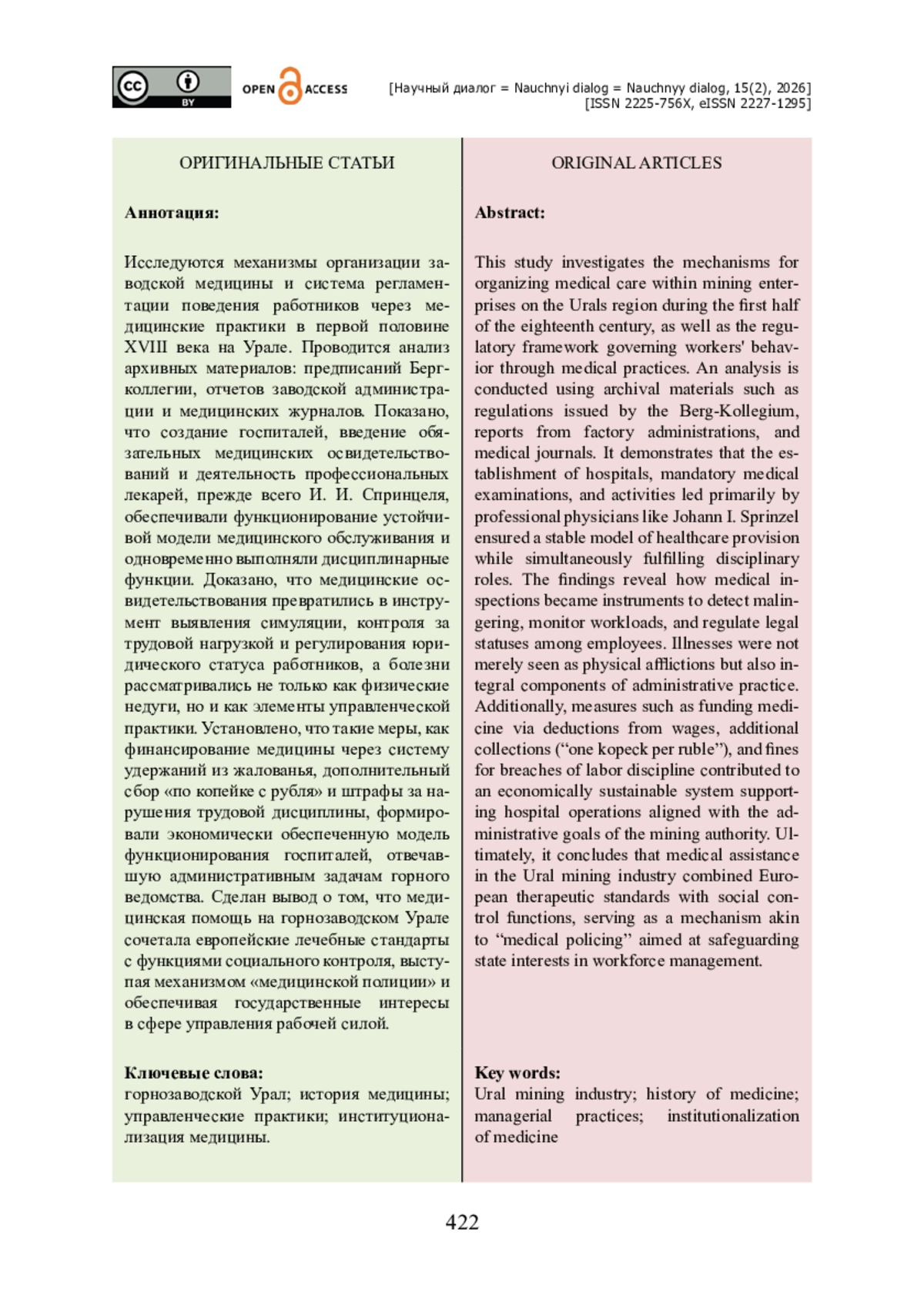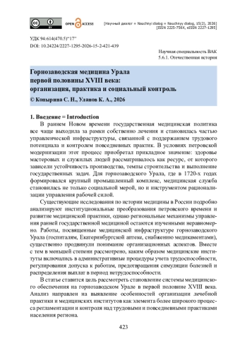 Исследуются механизмы организации заводской медицины и система регламентации поведения работников через медицинские практики в первой половине XVIII века на Урале. Проводится анализ архивных материалов: предписаний Берг-коллегии, отчетов заводской администрации и медицинских журналов. Показано, что создание госпиталей, введение обязательных медицинских освидетельствований и деятельность профессиональных лекарей, прежде всего И. И. Спринцеля, обеспечивали функционирование устойчивой модели медицинского обслуживания и одновременно выполняли дисциплинарные функции. Доказано, что медицинские освидетельствования превратились в инструмент выявления симуляции, контроля за трудовой нагрузкой и регулирования юридического статуса работников, а болезни рассматривались не только как физические недуги, но и как элементы управленческой практики. Установлено, что такие меры, как финансирование медицины через систему удержаний из жалованья, дополнительный сбор «по копейке с рубля» и штрафы за нарушения трудовой дисциплины, формировали экономически обеспеченную модель функционирования госпиталей, отвечавшую административным задачам горного ведомства. Сделан вывод о том, что медицинская помощь на горнозаводском Урале сочетала европейские лечебные стандарты с функциями социального контроля, выступая механизмом «медицинской полиции» и обеспечивая государственные интересы в сфере управления рабочей силой.
