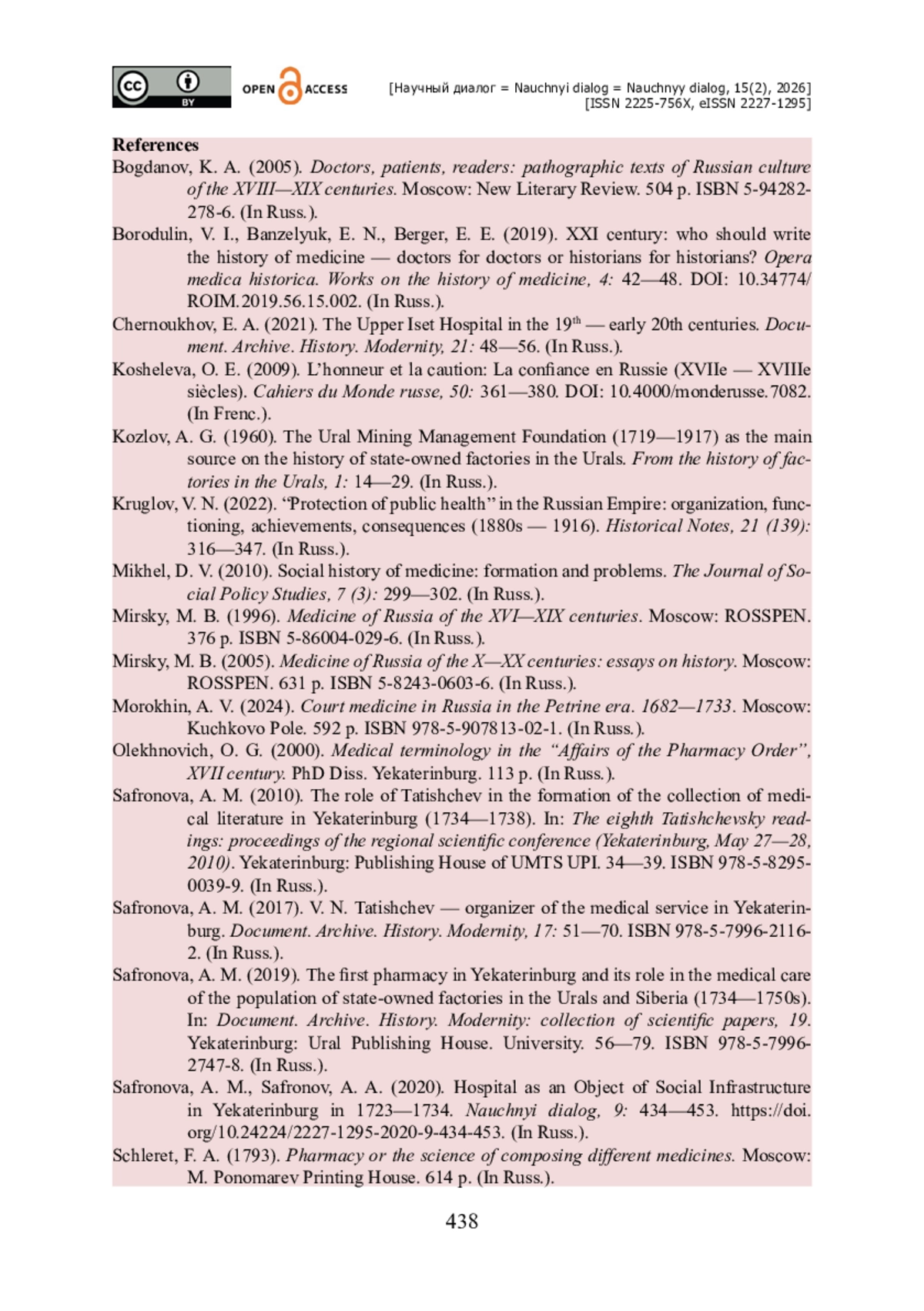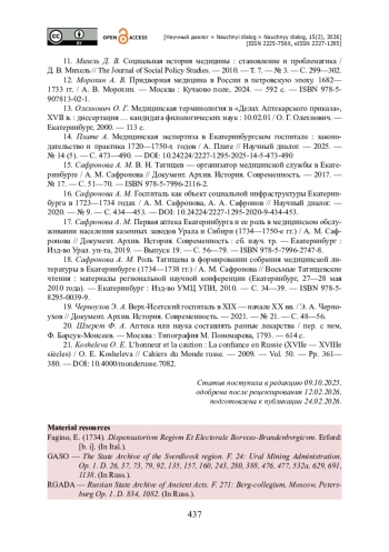 16. Сафронова А. М. Госпиталь как объект социальной инфраструктуры Екатеринбурга в 1723-1734 годах / А. М. Сафронова, А. А. Сафронов // Научный диалог. - 2020. - № 9. - С. 434-453. - https://doi.org/10.24224/2227-1295-2020-9-434-453.