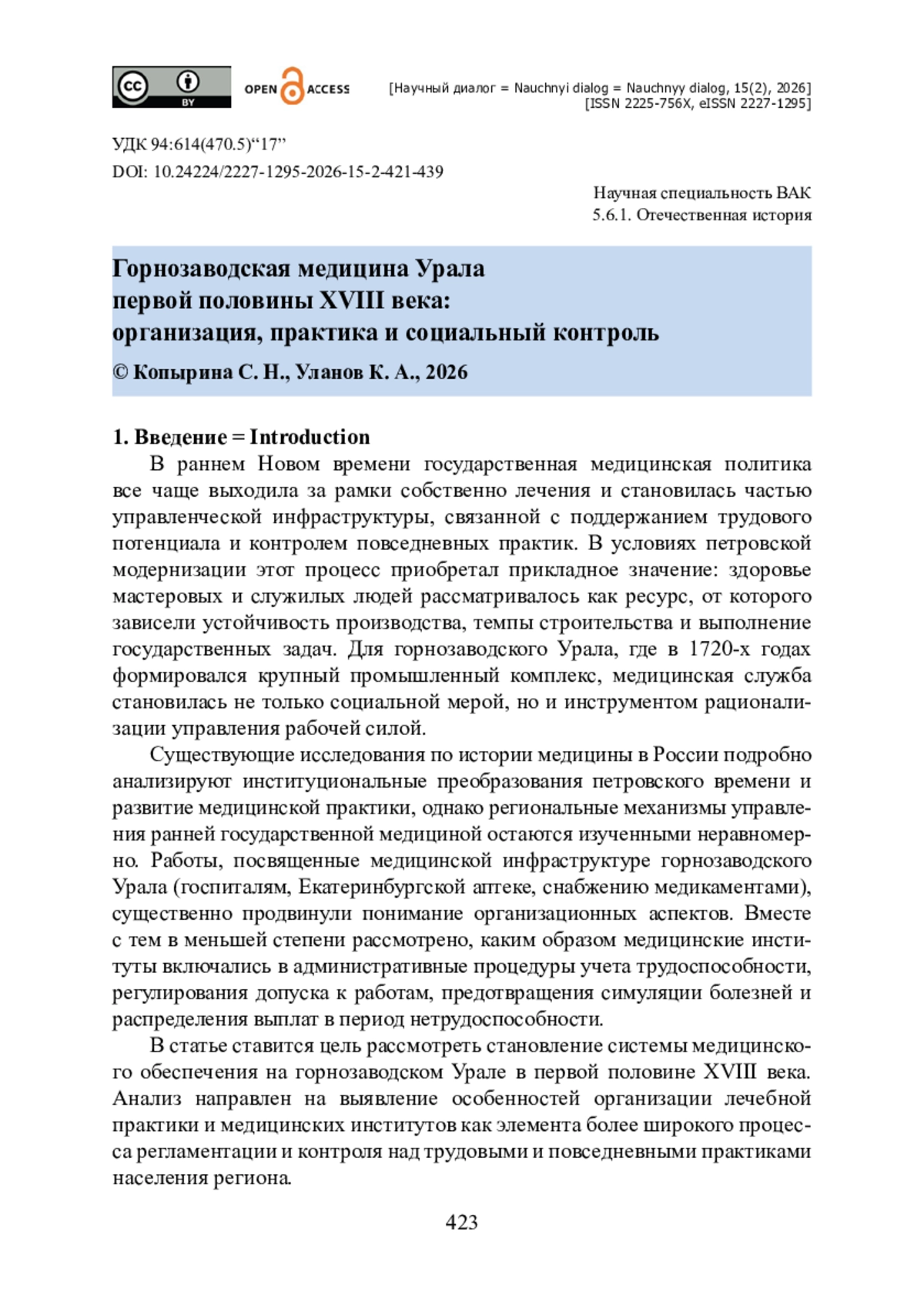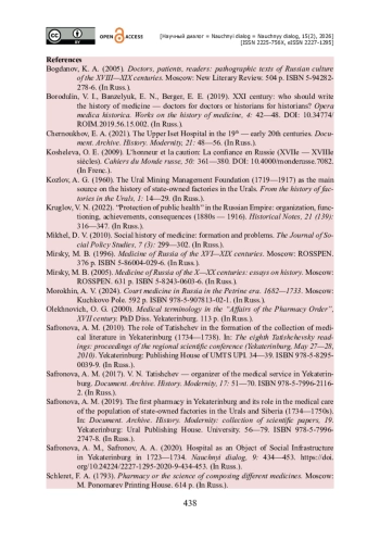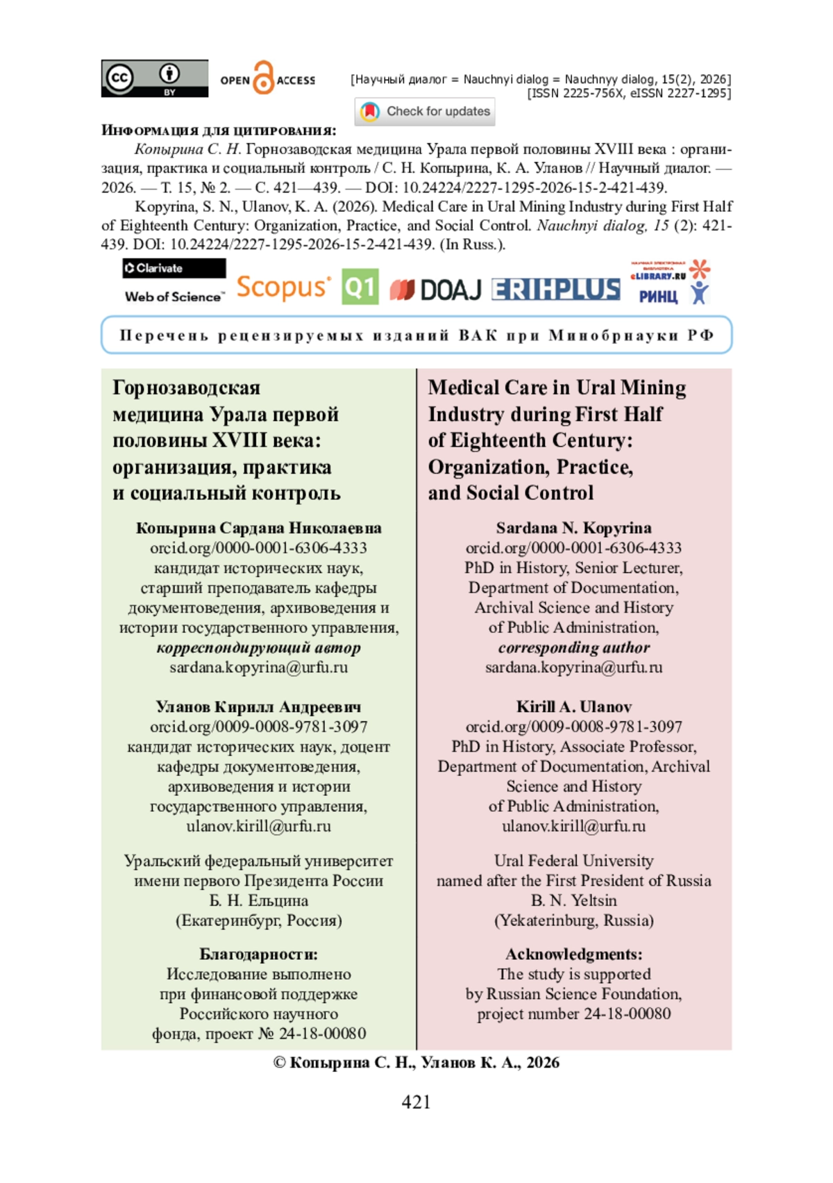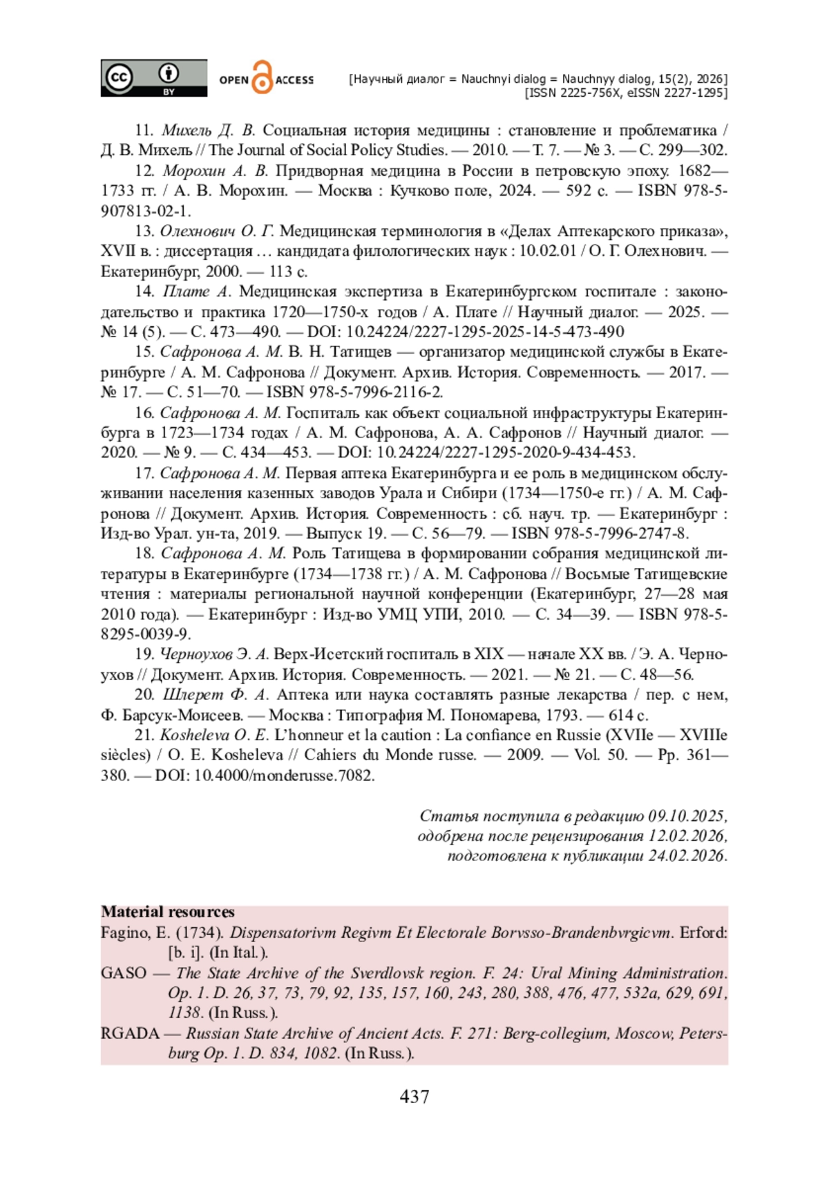 14. Плате А. Медицинская экспертиза в Екатеринбургском госпитале : законодательство и практика 1720-1750-х годов / А. Плате // Научный диалог. - 2025. - № 14 (5). - С. 473-490. - https://doi.org/10.24224/2227-1295-2025-14-5-473-490