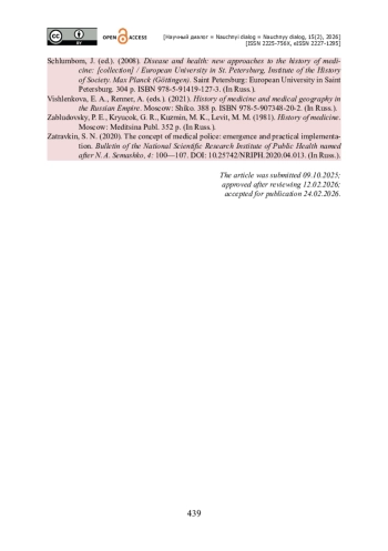 5. Затравкин С. Н. Концепция медицинской полиции : возникновение и практическая реализация / С. Н. Затравкин // Бюллетень Национального научно-исследовательского института общественного здоровья им. Н. А. Семашко. - 2020. - № 4. - С. 100-107. - https://doi.org/10.25742/NRIPH.2020.04.013.