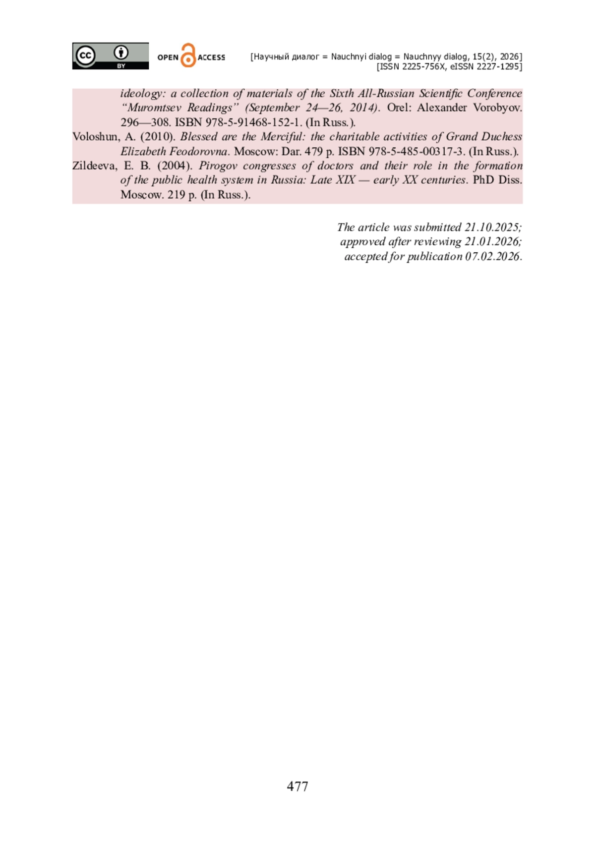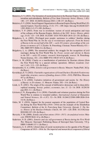 13. Литвинова И. Н. Благотворительные и волонтерские практики периода первой Мировой войны в отношении раненых воинов / И. Н. Литвинова, О. А. Карагодина // Международный журнал гуманитарных и естественных наук. - 2024. - № 10-4 (97). - С. 52-56. - https://doi.org/10.24412/2500-1000-2024-10-4-52-56.