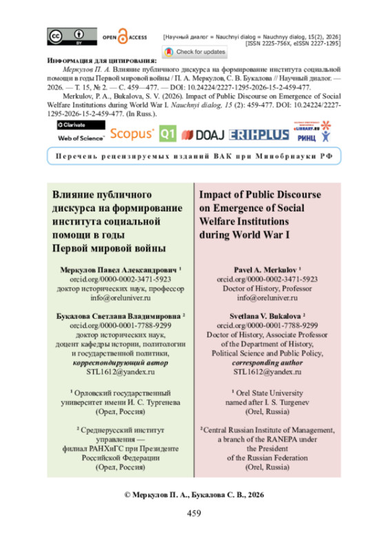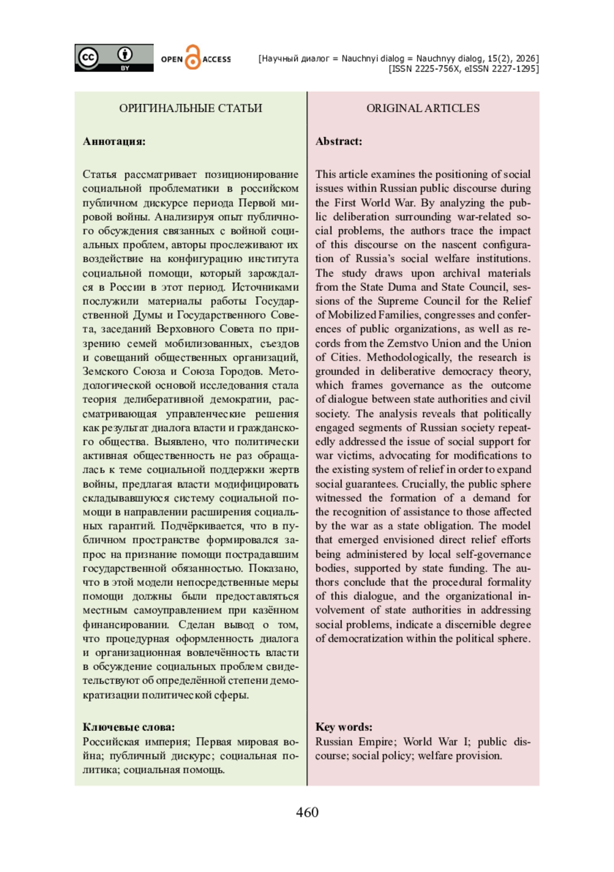 Статья рассматривает позиционирование социальной проблематики в российском публичном дискурсе периода Первой мировой войны. Анализируя опыт публичного обсуждения связанных с войной социальных проблем, авторы прослеживают их воздействие на конфигурацию института социальной помощи, который зарождался в России в этот период. Источниками послужили материалы работы Государственной Думы и Государственного Совета, заседаний Верховного Совета по призрению семей мобилизованных, съездов и совещаний общественных организаций, Земского Союза и Союза Городов. Методологической основой исследования стала теория делиберативной демократии, рассматривающая управленческие решения как результат диалога власти и гражданского общества. Выявлено, что политически активная общественность не раз обращалась к теме социальной поддержки жертв войны, предлагая власти модифицировать складывавшуюся систему социальной помощи в направлении расширения социальных гарантий. Подчёркивается, что в публичном пространстве формировался запрос на признание помощи пострадавшим государственной обязанностью. Показано, что в этой модели непосредственные меры помощи должны были предоставляться местным самоуправлением при казённом финансировании. Сделан вывод о том, что процедурная оформленность диалога и организационная вовлечённость власти в обсуждение социальных проблем свидетельствуют об определённой степени демократизации политической сферы.