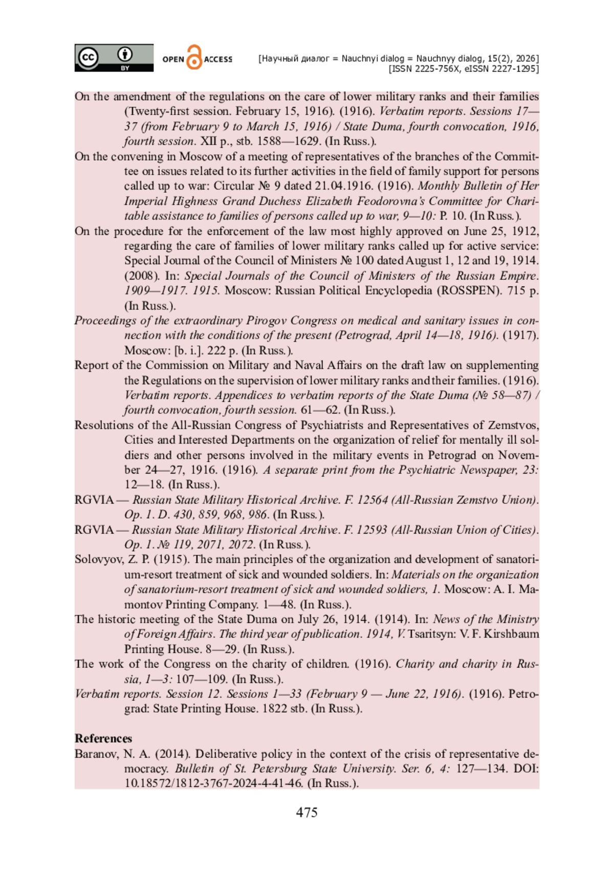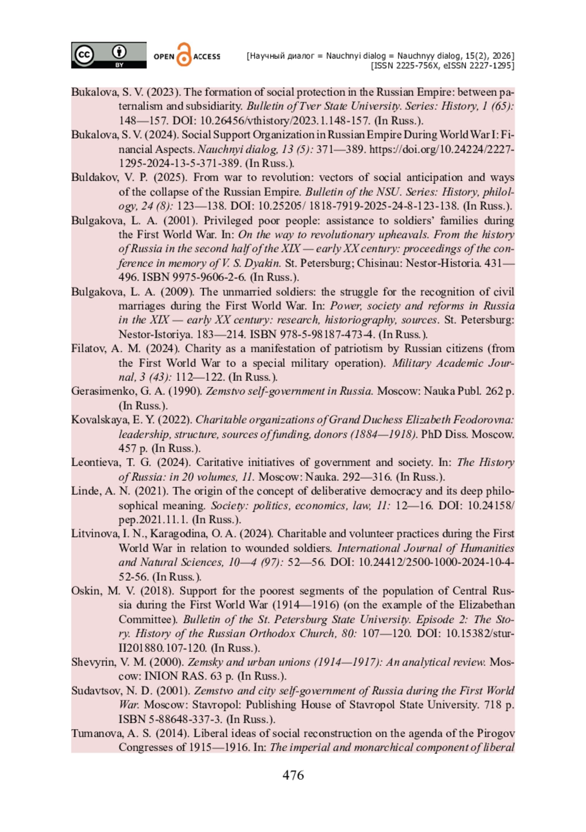 2. Букалова С. В. Организация социальной поддержки населения Российской империи в годы Первой мировой войны : финансовые аспекты / С. В. Букалова // Научный диалог. - 2024. - Т. 13. - № 5. - С. 371-389. - https://doi.org/10.24224/2227-1295-2024-13-5-371-389.