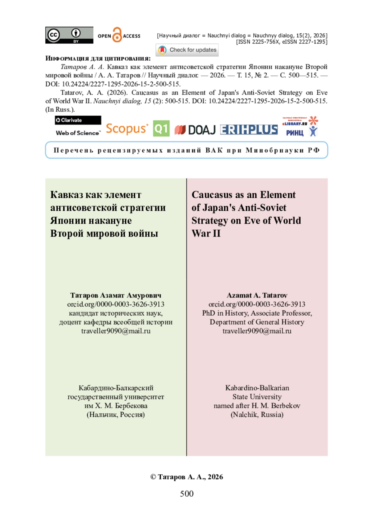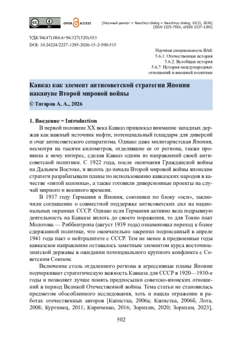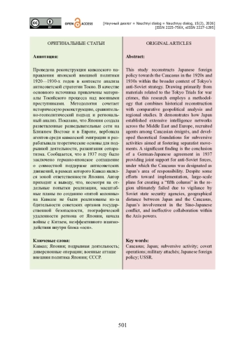 Проведена реконструкция кавказского направления японской внешней политики 1920—1930-х годов в контексте анализа антисоветской стратегии Токио. В качестве основного источника привлечены материалы Токийского процесса над военными преступниками. Методология сочетает историческую реконструкцию, сравнительно-геополитический подход и региональный анализ. Показано, что Япония создала разветвленные разведывательные сети на Ближнем Востоке и в Европе, вербовала агентов среди кавказской эмиграции и разрабатывала теоретические основы для подрывной деятельности, разжигания сепаратизма. Сообщается, что в 1937 году было заключено германо-японское соглашение о совместной поддержке антисоветских движений, в рамках которого Кавказ являлся зоной ответственности Японии. Автор приходит к выводу, что, несмотря на отдельные попытки реализации, масштабные планы по созданию «пятой колонны» на Кавказе не были реализованы из-за бдительности советских органов государственной безопасности, географической удаленности региона от Японии, начала войны с Китаем, неэффективного взаимодействия внутри блока «оси».