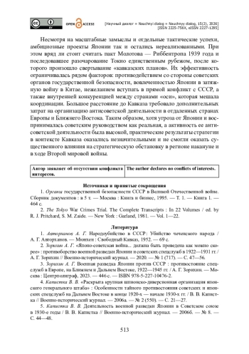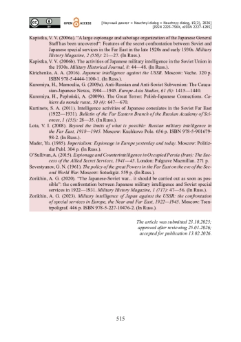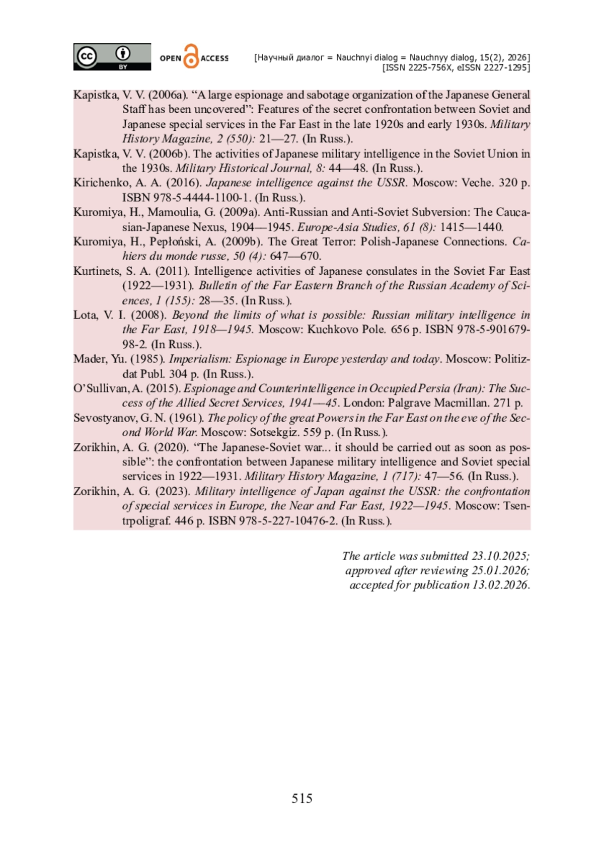 2. Зорихин А. Г. «Японо-советская война... должна быть проведена как можно скорее» : противоборство военной разведки Японии и советских спецслужб в 1922-1931 гг. / А. Г. Зорихин // Военно-исторический журнал. - 2020. - № 1 (717). - С. 47-56.