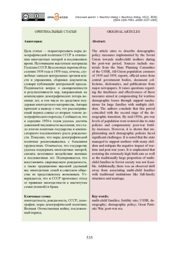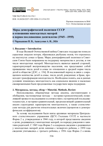 Цель статьи — охарактеризовать меры демографической политики СССР в отношении многодетных матерей в послевоенное время. Источниками выступили материалы Госплана СССР, Всесоюзных переписей населения 1939 года и 1959 года, отчеты, служебные записки центральных органов власти и управления, сборники документов, словари публикации центральной прессы. Поднимается вопрос о своевременности и результативности мер, направленных на компенсацию демографических потерь военных лет, в том числе по средствам поддержки многодетного материнства. Авторы приходят к выводу о том, что рассматриваемый период совпал со вторым этапом демографического перехода. Сообщается, что к середине 1950-х годов удалось достичь довоенной численности населения, что стало итогом политики государства и компенсаторного послевоенного роста рождаемости. Показано, что меры демографической политики реализовывались с большими трудностями. Отмечается, что государству удалось поддержать многодетных матерей, снизить негативное воздействие военных и послевоенных лет. Подчеркивается, что восстановить сверхвысокую рождаемость, а также традиционно высокий удельный вес многодетных семей в советском обществе не представлялось возможным. Утверждается, что в СССР произошел отход от привязки многодетности к институтам семьи (полной) и брака.