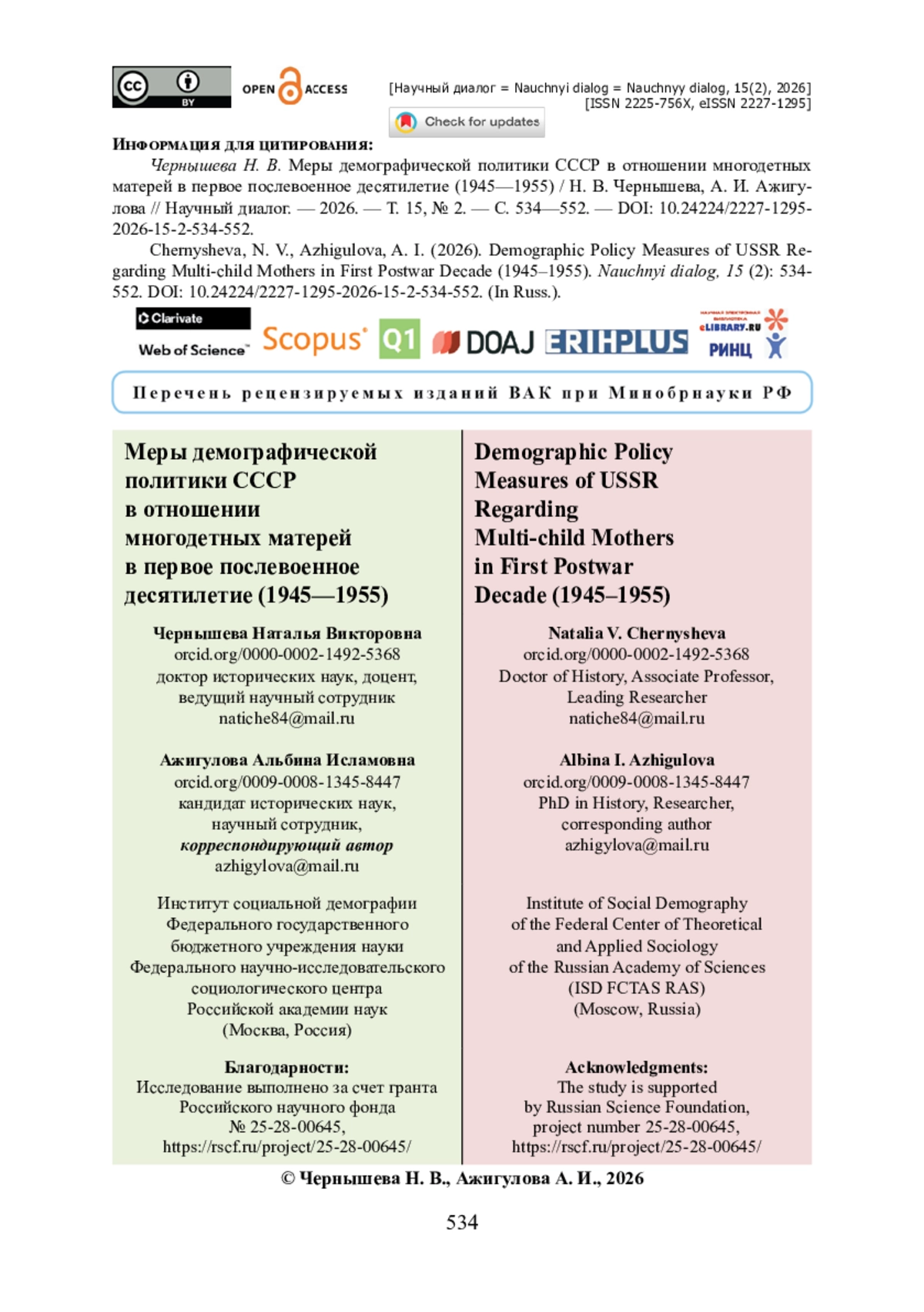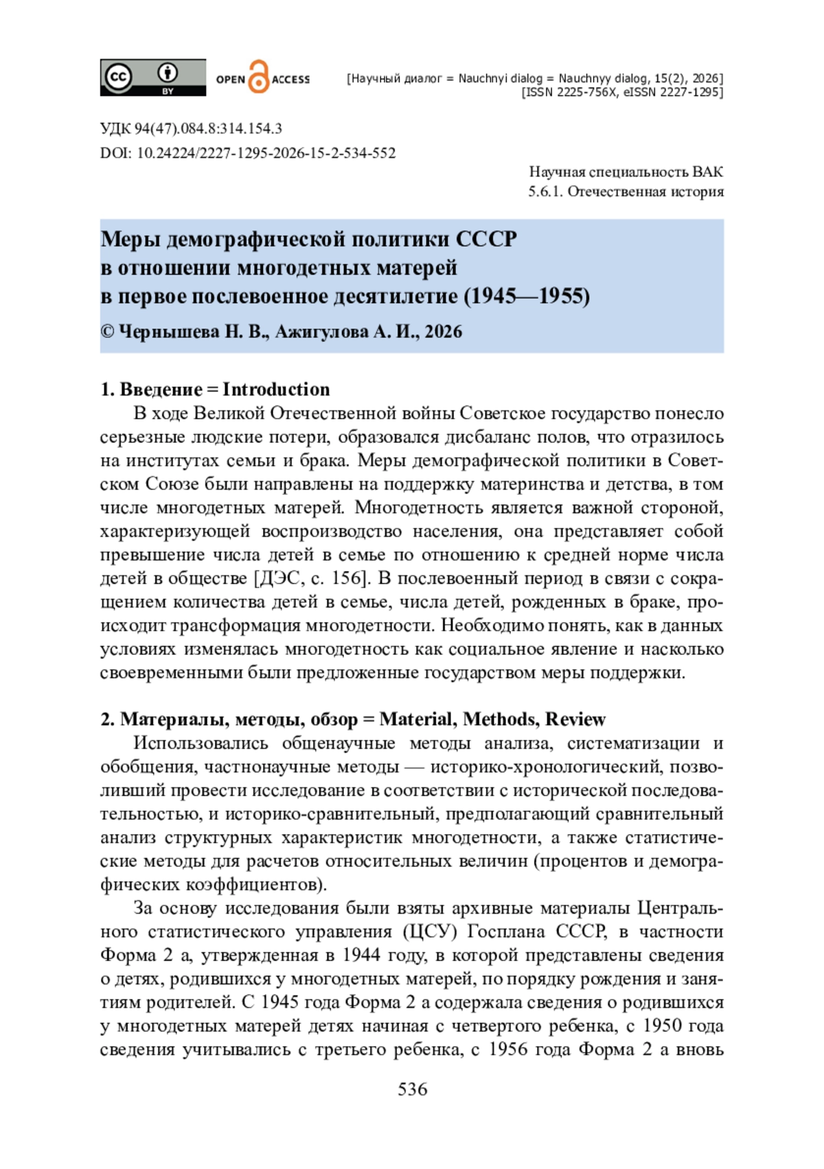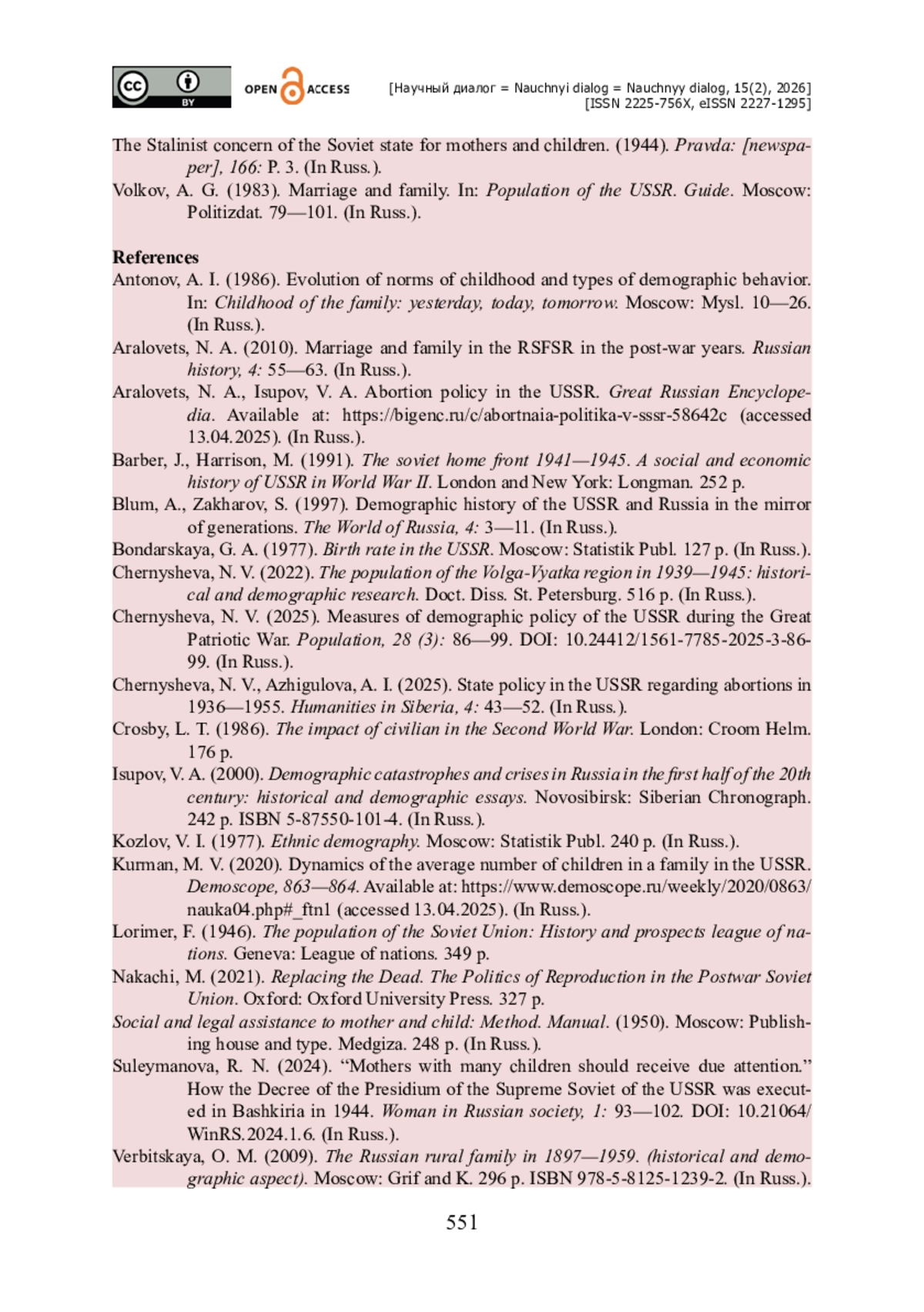 19. Чернышева Н. В. Государственная политика в СССР в отношении абортов в 1936-1955 гг. / Н. В. Чернышева, А. И. Ажигулова // Гуманитарные науки в Сибири. - 2025. - № 4. - С. 43-52.