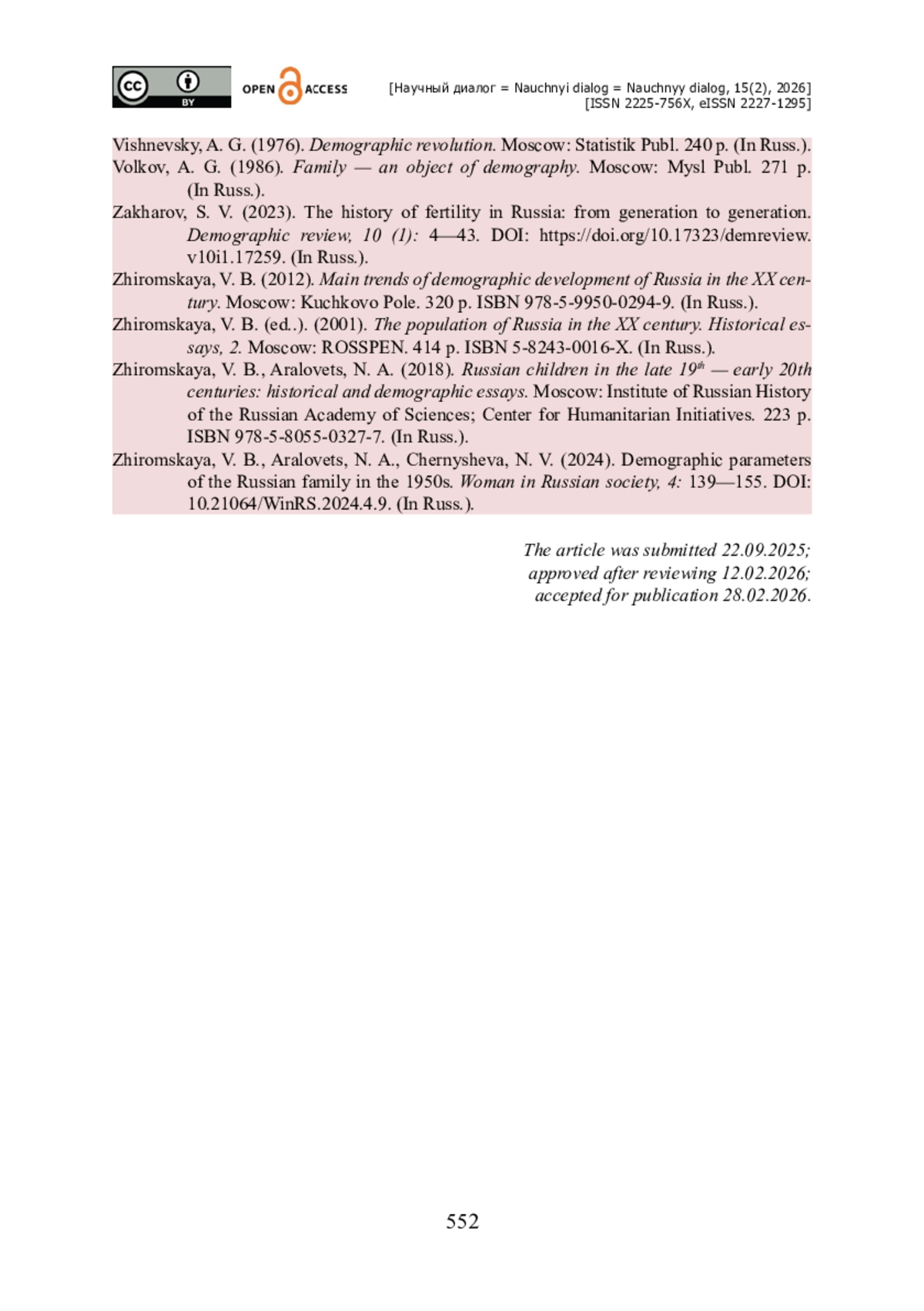 11. Жиромская В. Б. Демографические параметры российской семьи в 1950-х гг. / В. Б. Жиромская, Н. А. Араловец, Н. В. Чернышева // Женщина в российском обществе. - 2024. - № 4. - С. 139-155. - https://doi.org/10.21064/WinRS.2024.4.9.