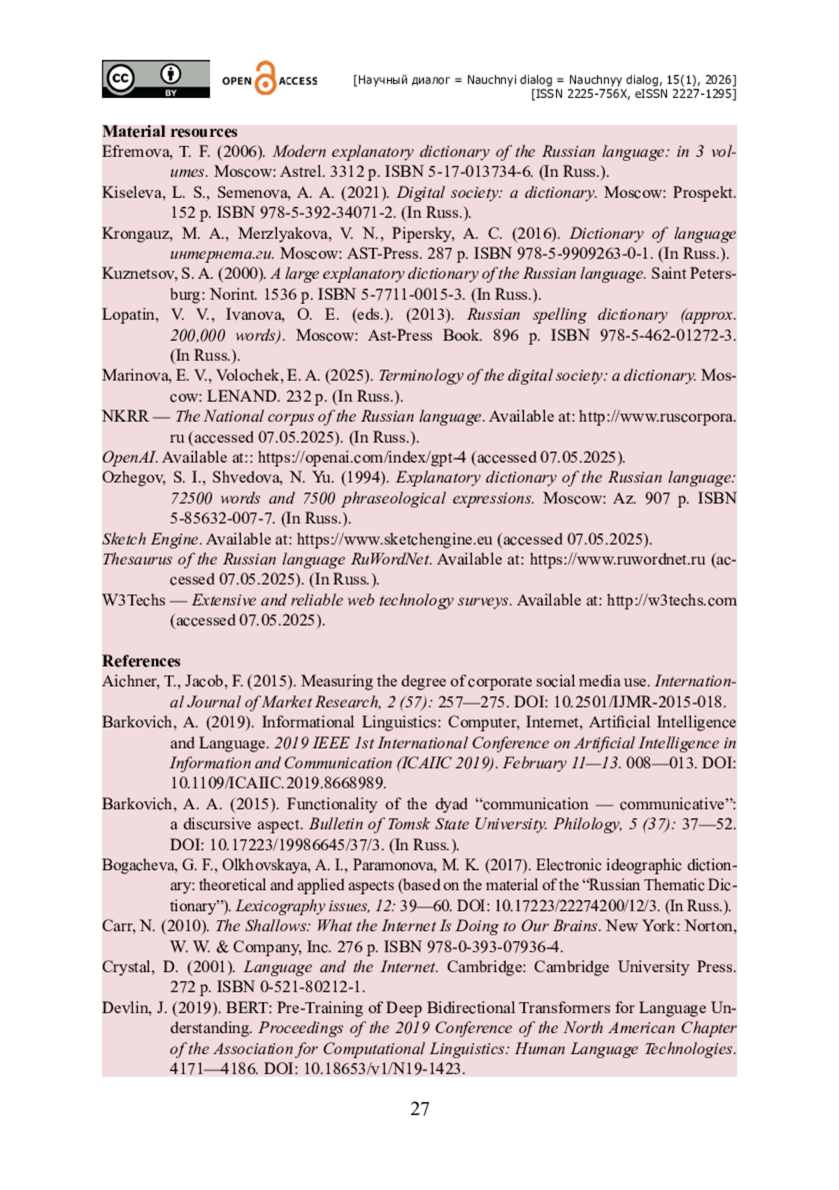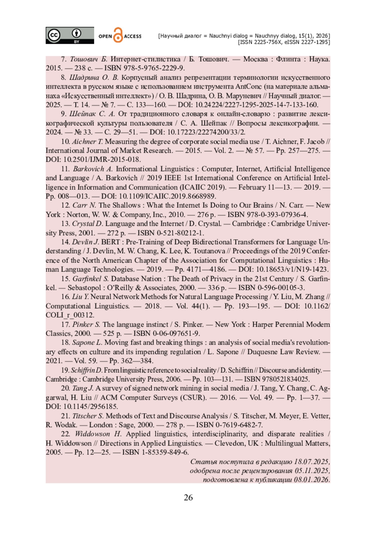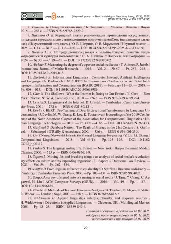 11. Barkovich A. Informational Linguistics : Computer, Internet, Artificial Intelligence and Language / A. Barkovich // 2019 IEEE 1st International Conference on Artificial Intelligence in Information and Communication (ICAIIC 2019). - February 11-13. - 2019. - Pp. 008-013. - https://doi.org/10.1109/ICAIIC.2019.8668989.