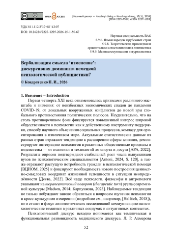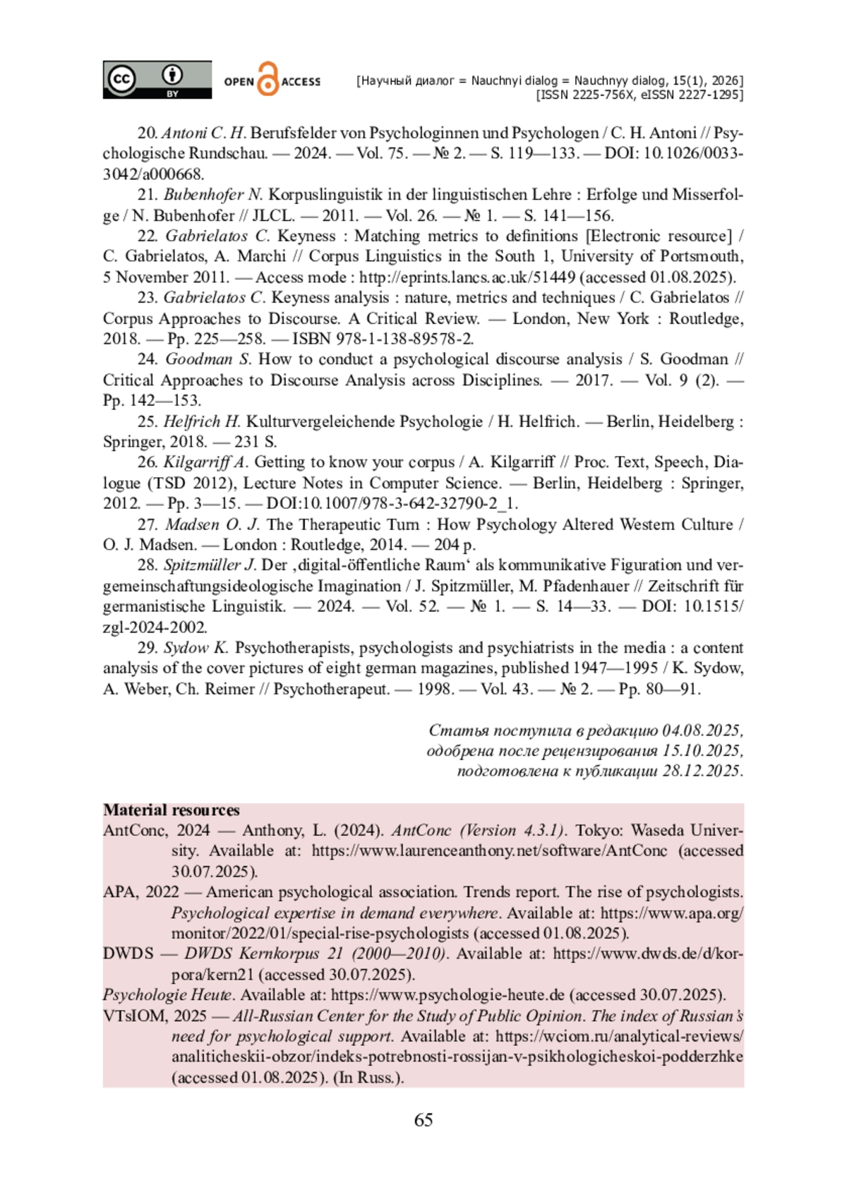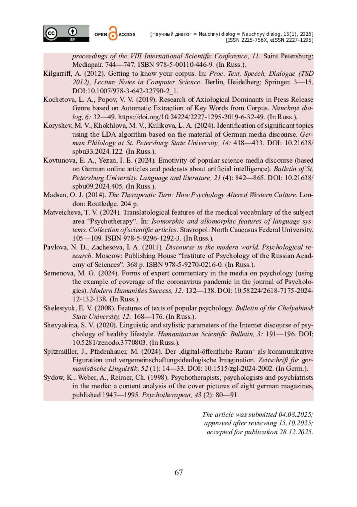 15. Семенова М. Г. Формы экспертного комментария в СМИ на тему психологии (на примере освещения темы пандемии коронавируса в журнале Psychologies) / М. Г. Семенова // Modern Humanities Success. - 2024. - № 12. - С. 132-138. - https://doi.org/10.58224/2618-7175-2024-12-132-138.