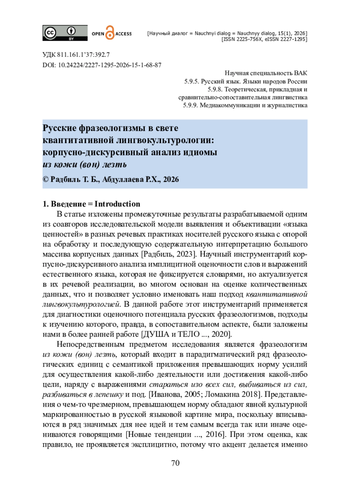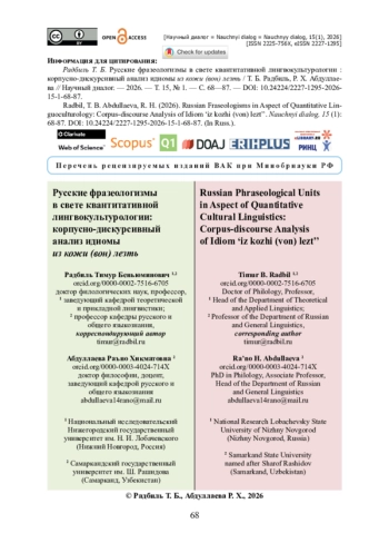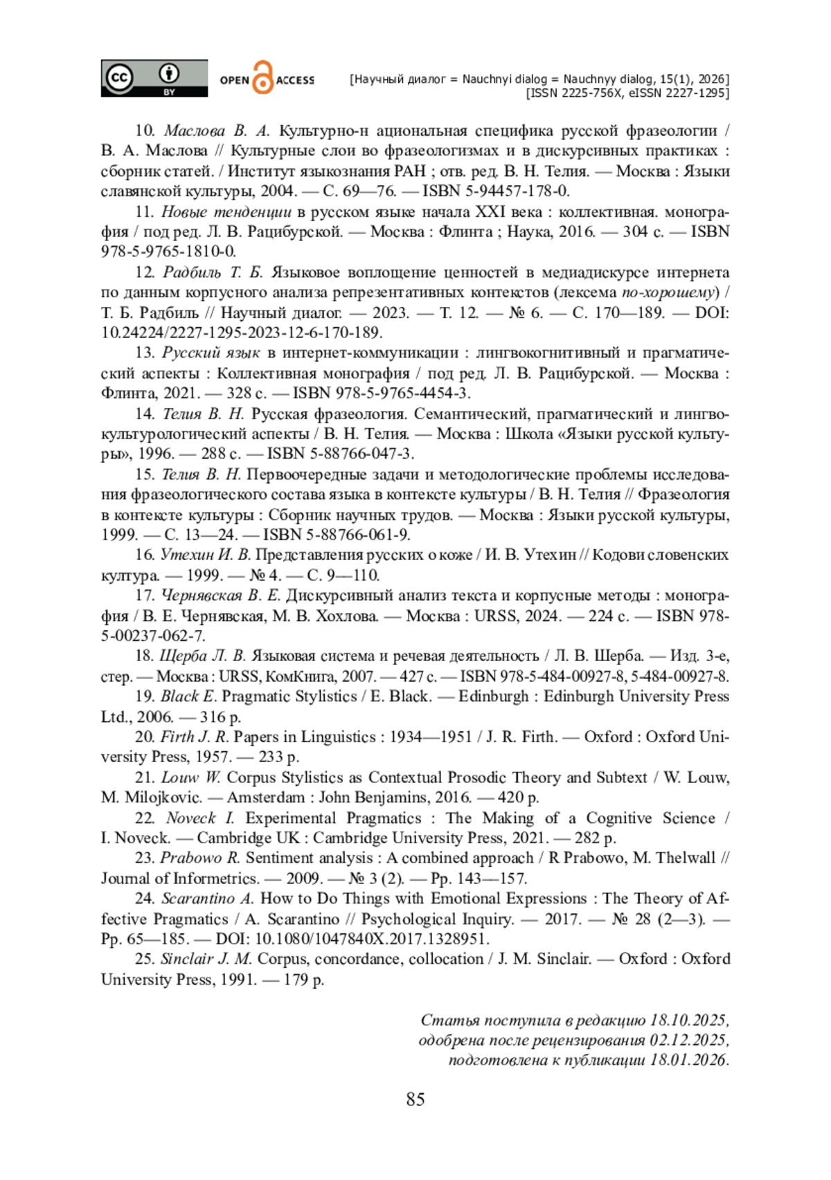 12. Радбиль Т. Б. Языковое воплощение ценностей в медиадискурсе интернета по данным корпусного анализа репрезентативных контекстов (лексема по-хорошему) / Т. Б. Радбиль // Научный диалог. - 2023. - Т. 12. - № 6. - С. 170-189. - https://doi.org/10.24224/2227-1295-2023-12-6-170-189.