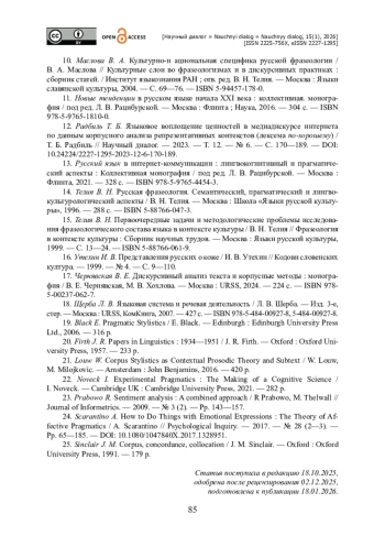 10. Маслова В. А. Культурно-национальная специфика русской фразеологии / В. А. Маслова // Культурные слои во фразеологизмах и в дискурсивных практиках : сборник статей. / Институт языкознания РАН ; отв. ред. В. Н. Телия. - Москва : Языки славянской культуры, 2004. - С. 69--76. - ISBN 5-94457-178-0.