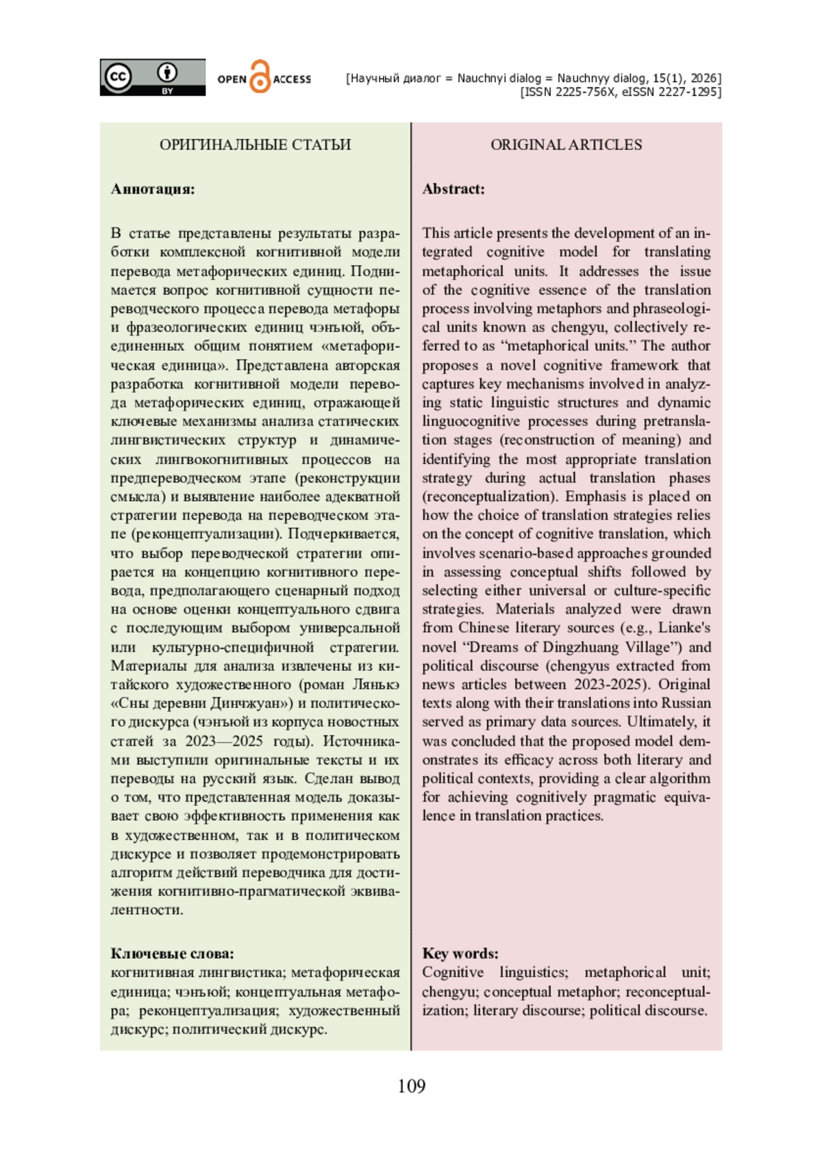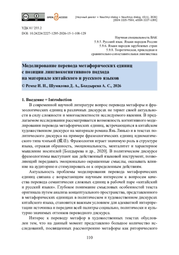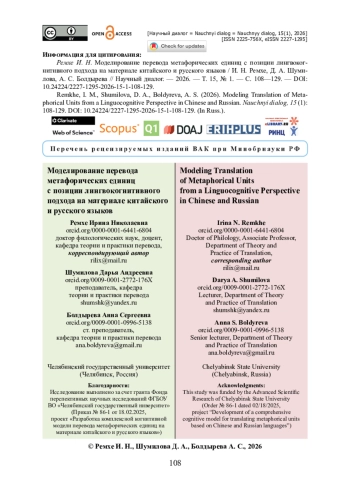 В статье представлены результаты разработки комплексной когнитивной модели перевода метафорических единиц. Поднимается вопрос когнитивной сущности переводческого процесса перевода метафоры и фразеологических единиц чэнъюй, объединенных общим понятием «метафорическая единица». Представлена авторская разработка когнитивной модели перевода метафорических единиц, отражающей ключевые механизмы анализа статических лингвистических структур и динамических лингвокогнитивных процессов на предпереводческом этапе (реконструкции смысла) и выявление наиболее адекватной стратегии перевода на переводческом этапе (реконцептуализации). Подчеркивается, что выбор переводческой стратегии опирается на концепцию когнитивного перевода, предполагающего сценарный подход на основе оценки концептуального сдвига с последующим выбором универсальной или культурно-специфичной стратегии. Материалы для анализа извлечены из китайского художественного (роман Лянькэ «Сны деревни Динчжуан») и политического дискурса (чэнъюй из корпуса новостных статей за 2023—2025 годы). Источниками выступили оригинальные тексты и их переводы на русский язык. Сделан вывод о том, что представленная модель доказывает свою эффективность применения как в художественном, так и в политическом дискурсе и позволяет продемонстрировать алгоритм действий переводчика для достижения когнитивно-прагматической эквивалентности.