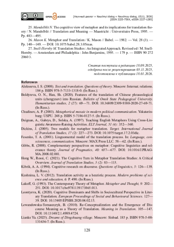 17. Hong W. The Cognitive Turn in Metaphor Translation Studies : A Critical Overview / W. Hong, C. Rossi // Journal of Translation Studies. - 2021. - Vol. 5 (2). - Pp. 83-115.