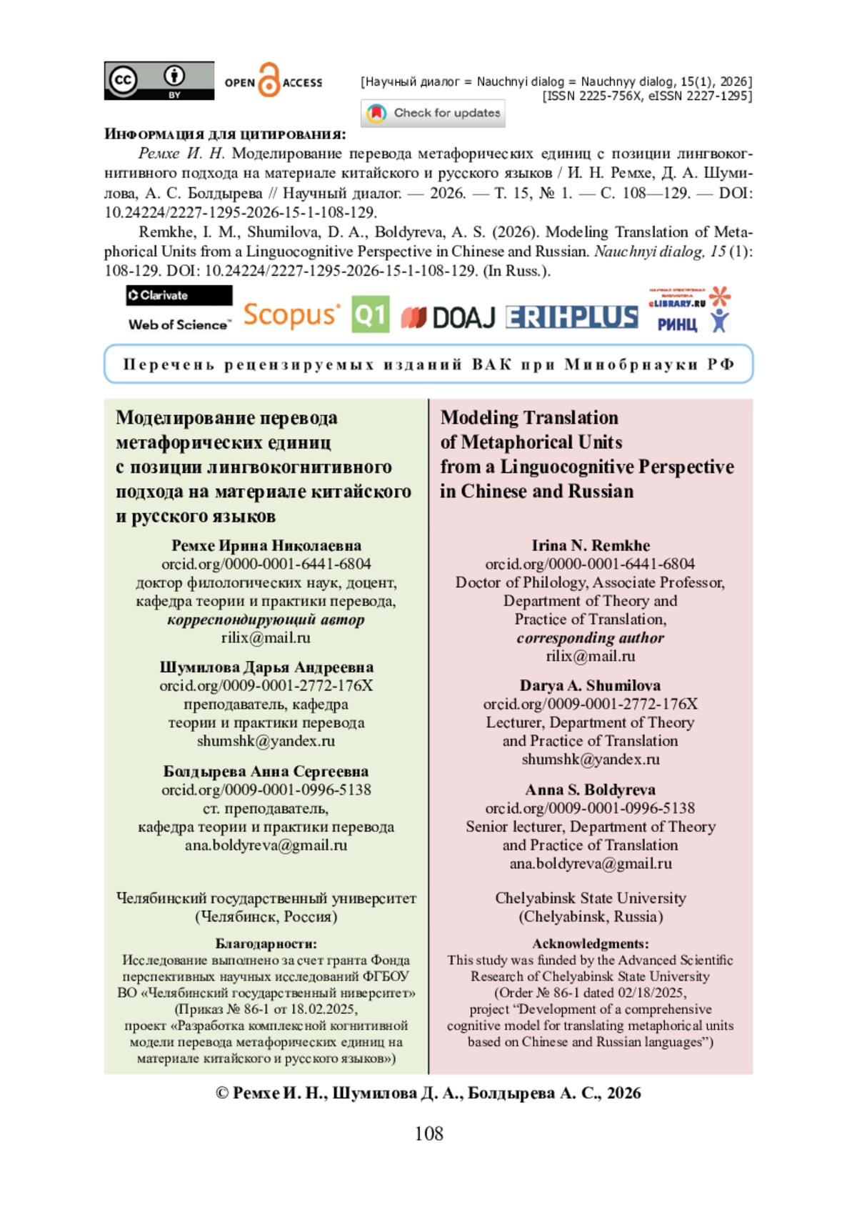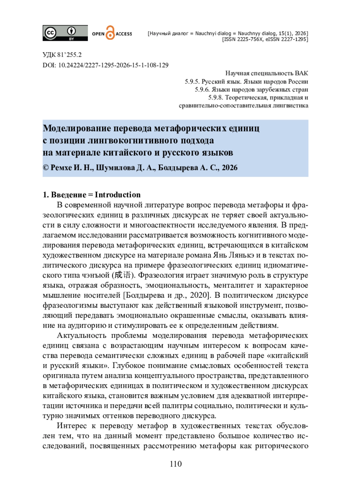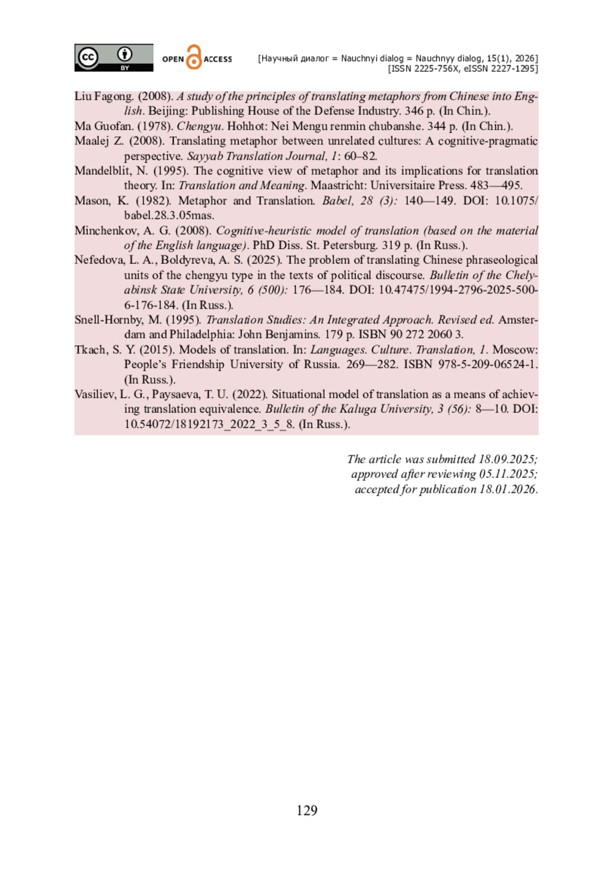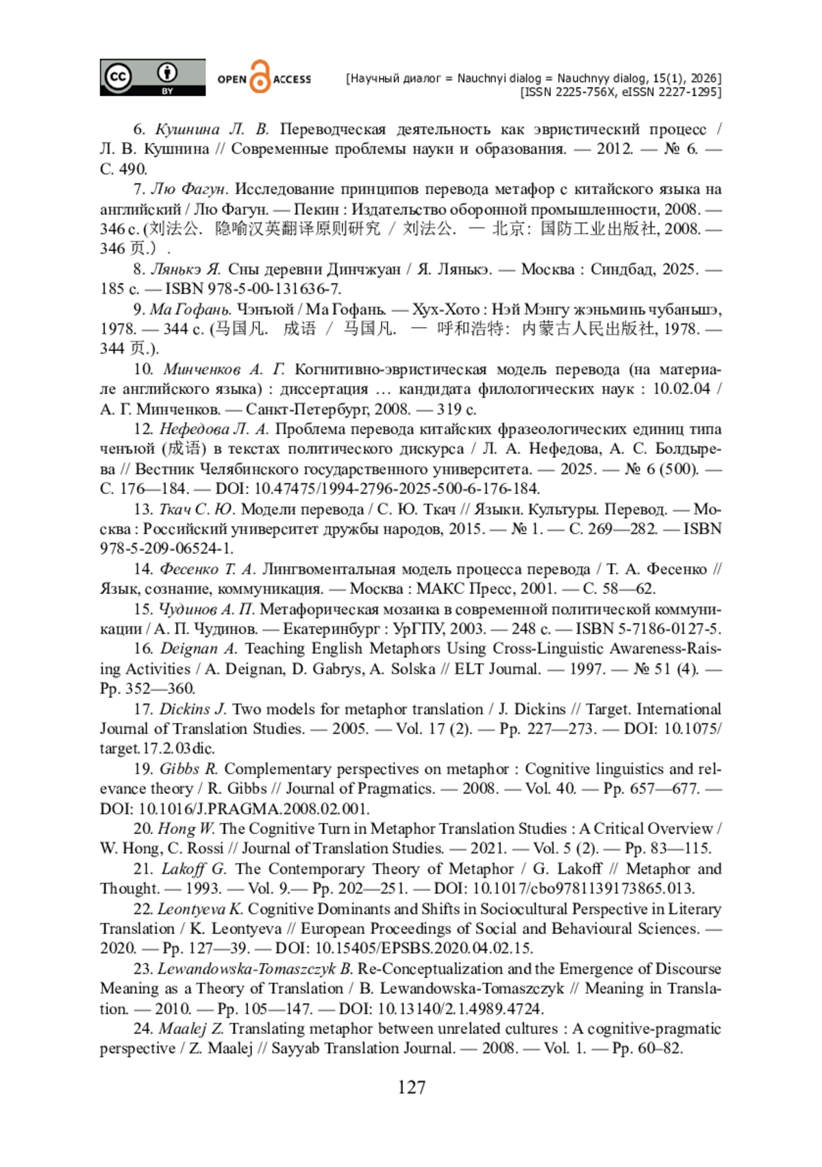 10. Нефедова Л. А. Проблема перевода китайских фразеологических единиц типа ченъюй (成语) в текстах политического дискурса / Л. А. Нефедова, А. С. Болдырева // Вестник Челябинского государственного университета. - 2025. - № 6 (500). - С. 176-184. - https://doi.org/10.47475/1994-2796-2025-500-6-176-184.