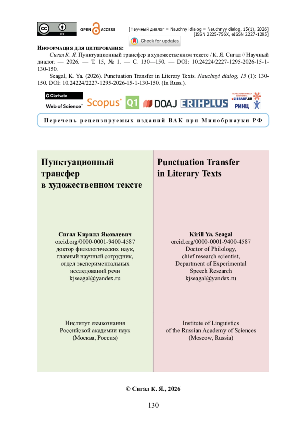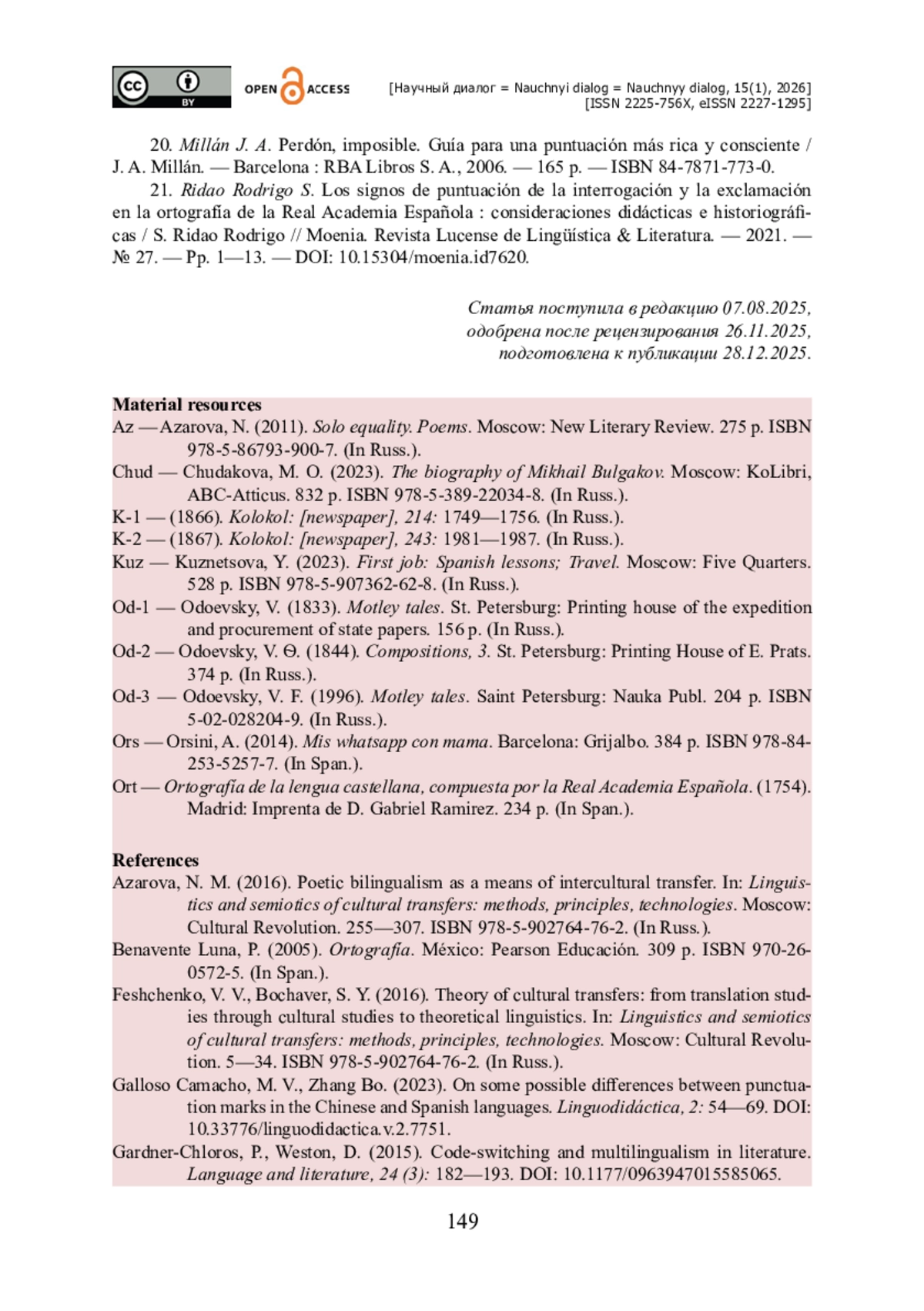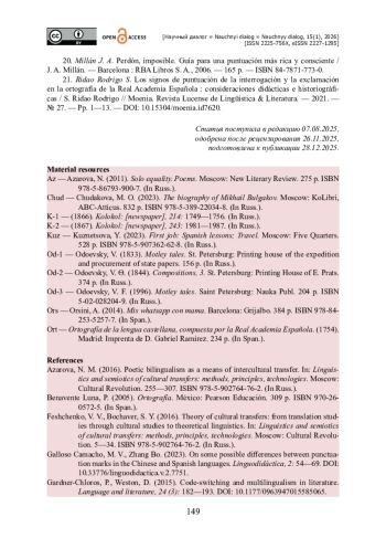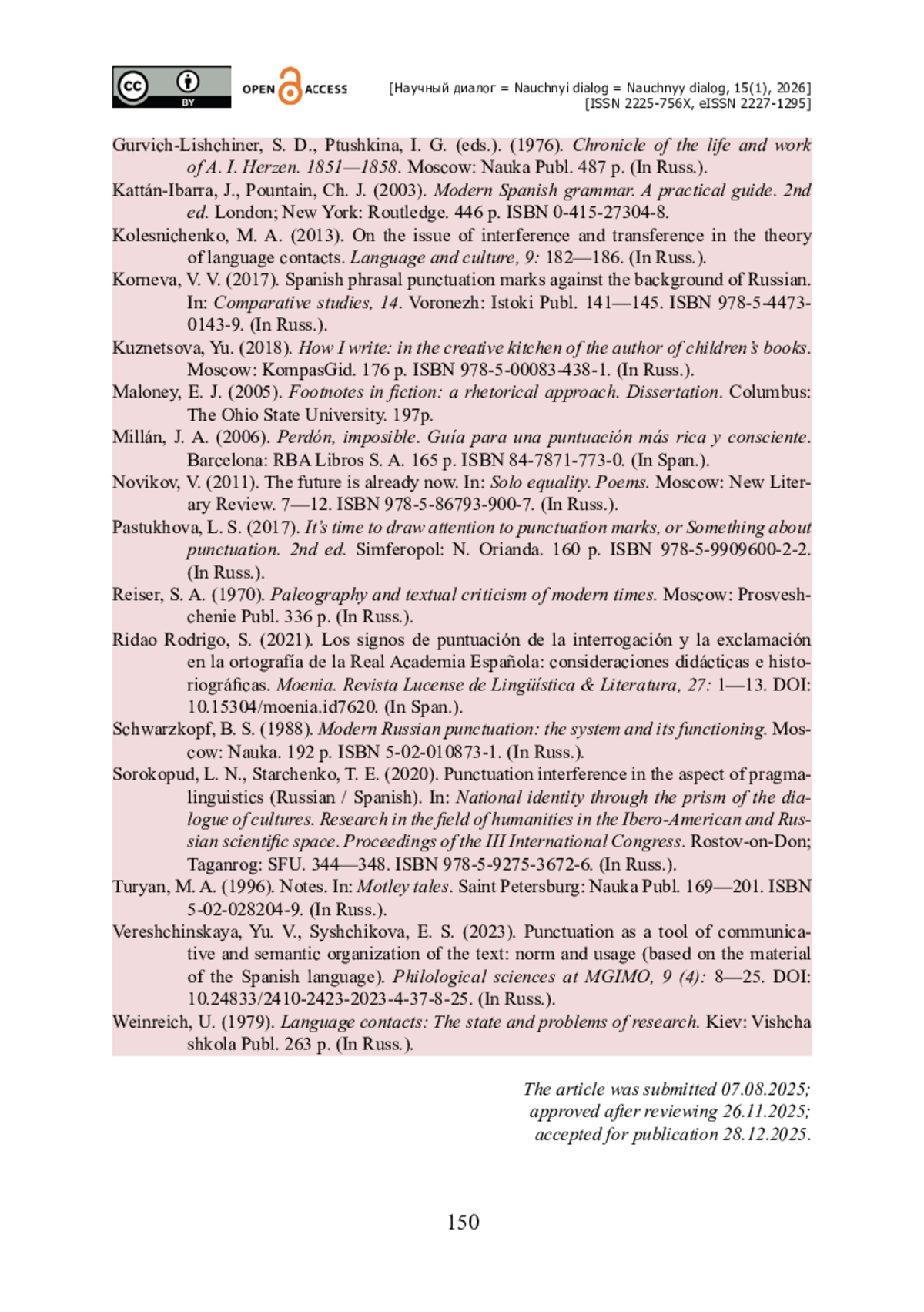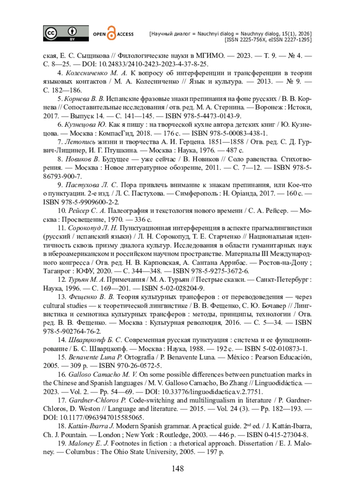3. Верещинская Ю. В. Пунктуация как инструмент коммуникативно-смысловой организации текста : норма и узус (на материале испанского языка) / Ю. В. Верещинская, Е. С. Сыщикова // Филологические науки в МГИМО. - 2023. - Т. 9. - № 4. - С. 8-25. - https://doi.org/10.24833/2410-2423-2023-4-37-8-25.