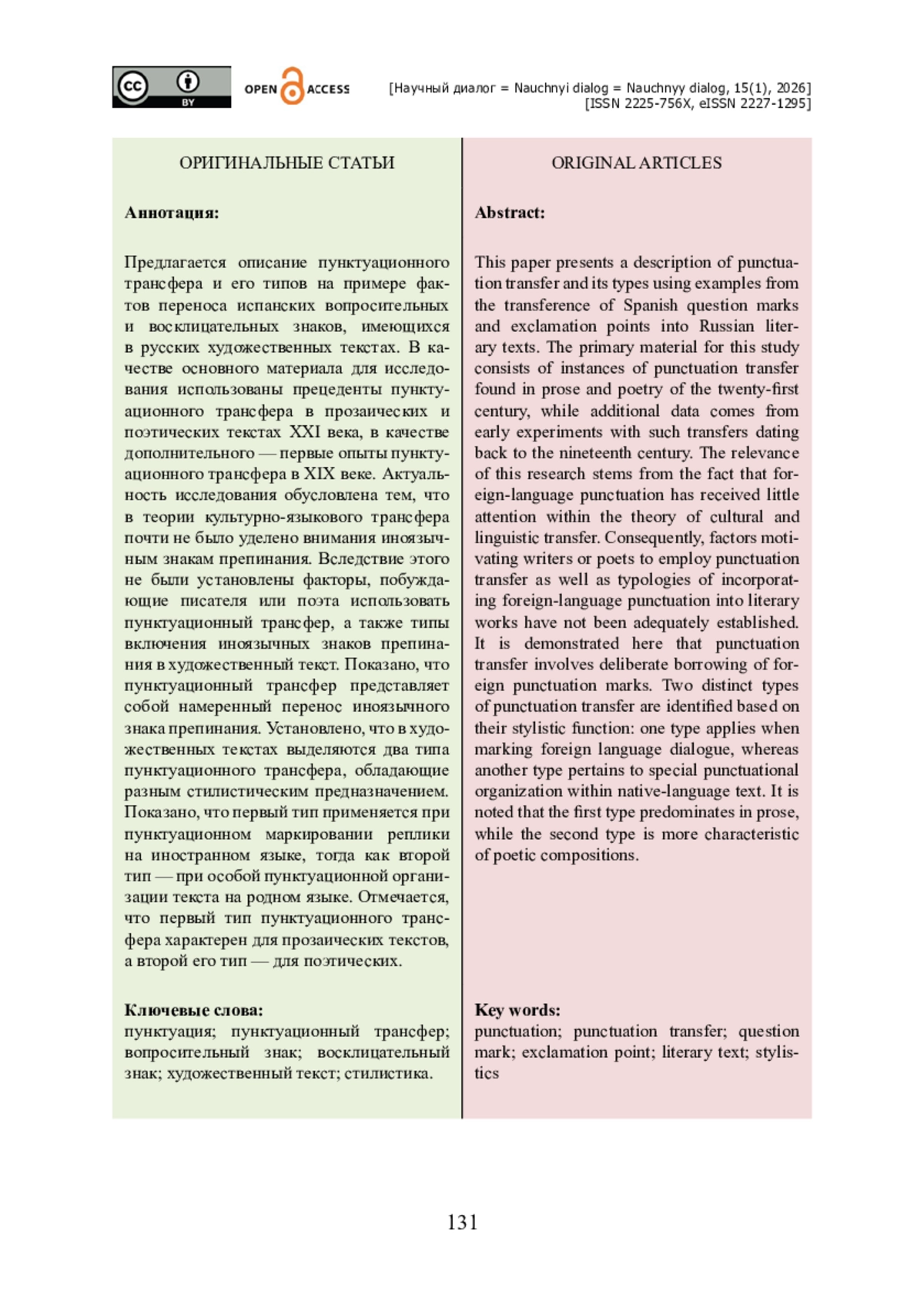 Предлагается описание пунктуационного трансфера и его типов на примере фактов переноса испанских вопросительных и восклицательных знаков, имеющихся в русских художественных текстах. В качестве основного материала для исследования использованы прецеденты пунктуационного трансфера в прозаических и поэтических текстах XXI века, в качестве дополнительного — первые опыты пунктуационного трансфера в XIX веке. Актуальность исследования обусловлена тем, что в теории культурно-языкового трансфера почти не было уделено внимания иноязычным знакам препинания. Вследствие этого не были установлены факторы, побуждающие писателя или поэта использовать пунктуационный трансфер, а также типы включения иноязычных знаков препинания в художественный текст. Показано, что пунктуационный трансфер представляет собой намеренный перенос иноязычного знака препинания. Установлено, что в художественных текстах выделяются два типа пунктуационного трансфера, обладающие разным стилистическим предназначением. Показано, что первый тип применяется при пунктуационном маркировании реплики на иностранном языке, тогда как второй тип — при особой пунктуационной организации текста на родном языке. Отмечается, что первый тип пунктуационного трансфера характерен для прозаических текстов, а второй его тип — для поэтических.