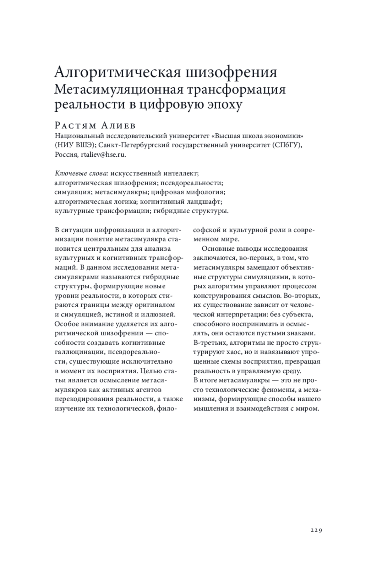 1. Алиев Р. Т. Метасимулякр и ИИ-симуляция: Человек, медиа, интерфейсы // Человек. 2025. Т. 36. № 1. С. 102-120. EDN: CKCJPM