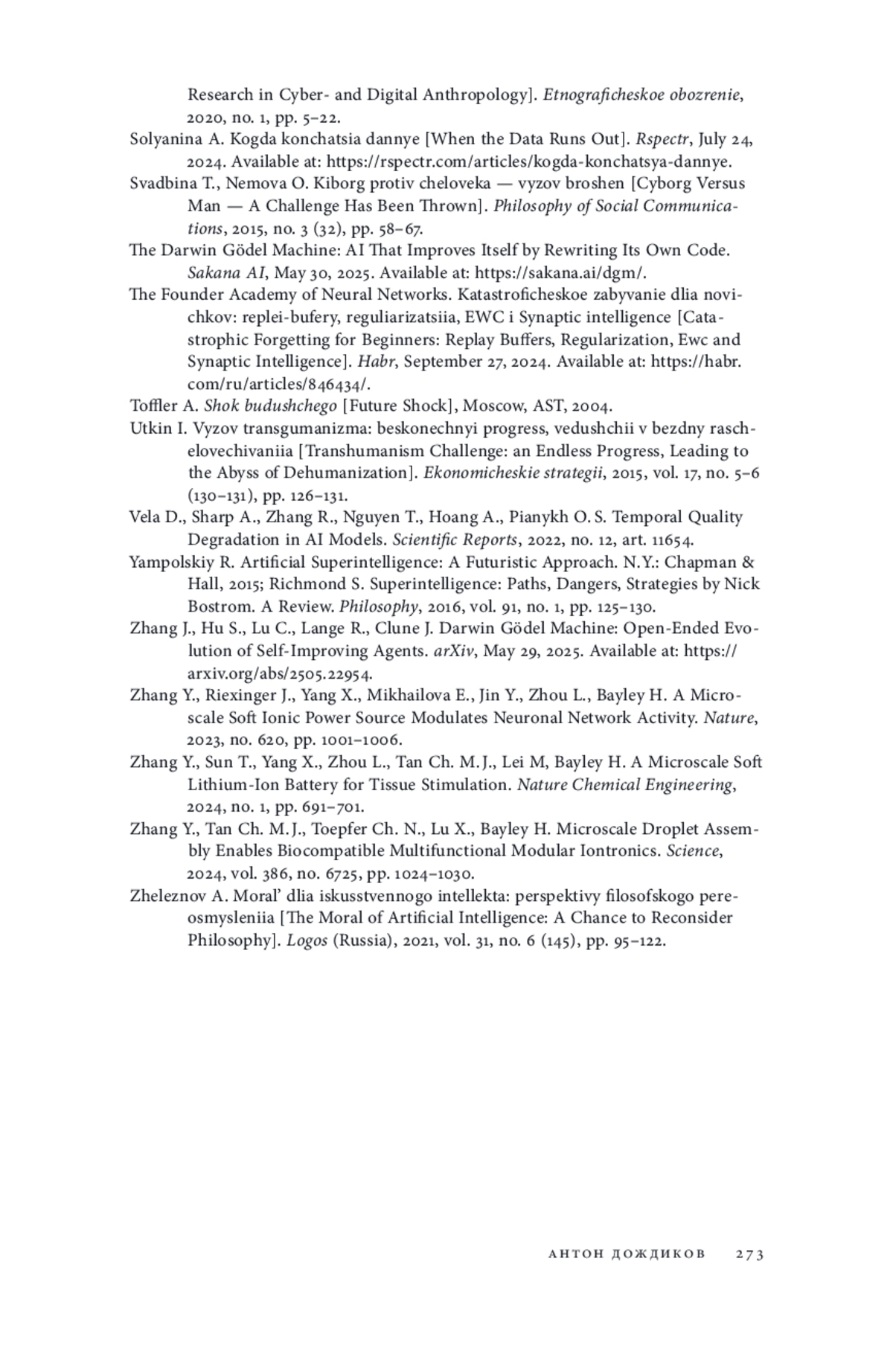 1. Алексеева Е. А. Расширенный киборг: концептуализация взаимосвязи людей и интеллектуальных систем // Философия науки и техники. 2024. Т. 29. № 1. С. 98-111. EDN: KXAZKE