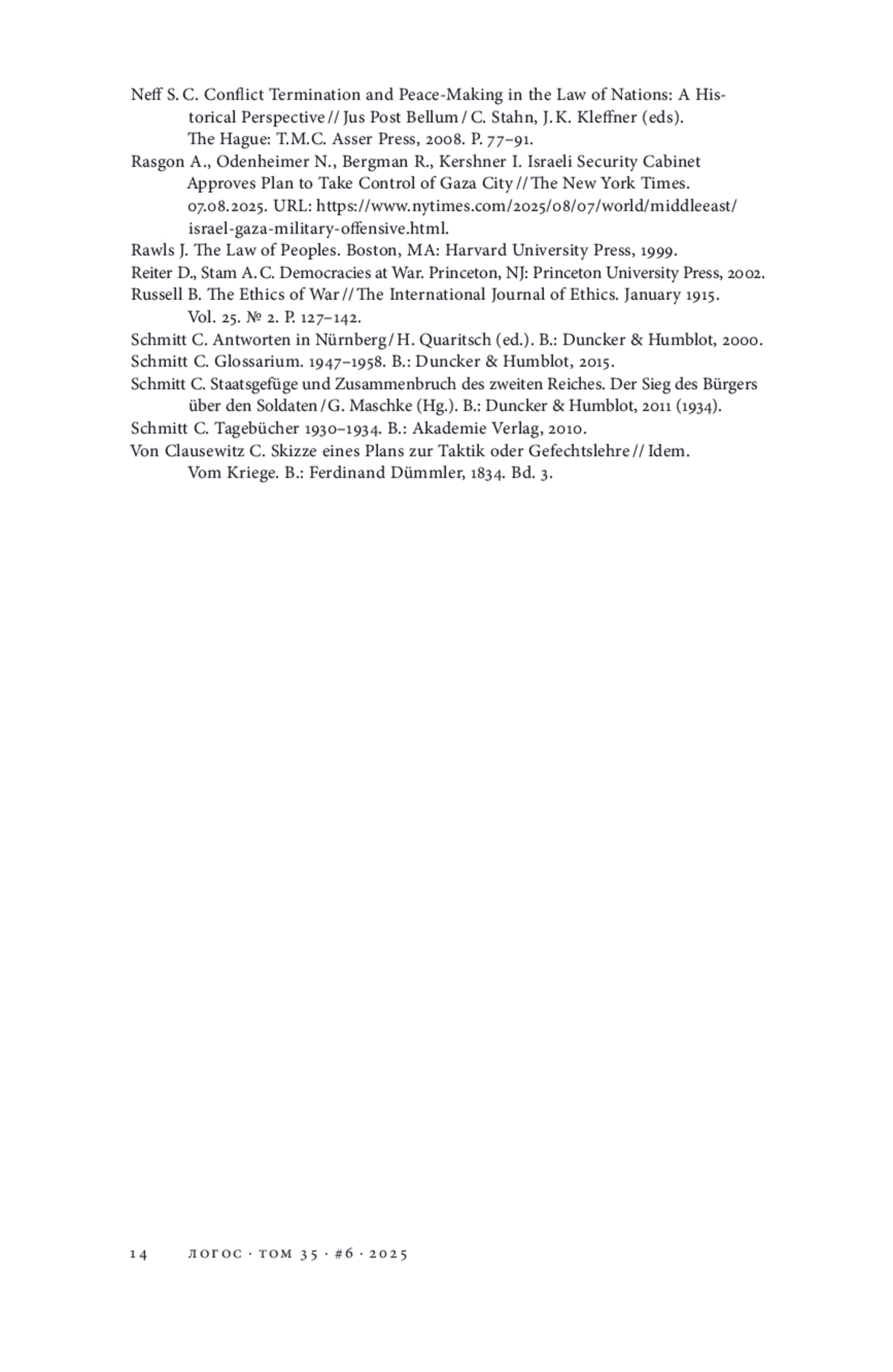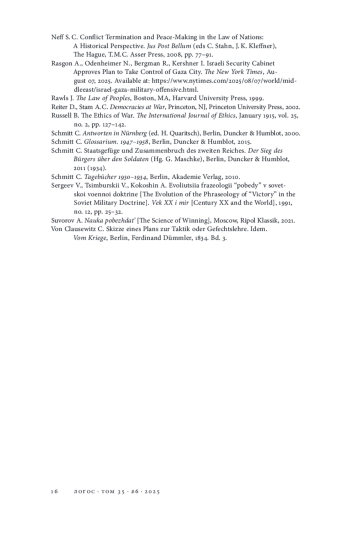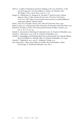 14. Neff S. C. Conflict Termination and Peace-Making in the Law of Nations: A Historical Perspective // Jus Post Bellum / C. Stahn, J. K. Kleffner (eds). The Hague: T.M.C. Asser Press, 2008. P. 77-91.