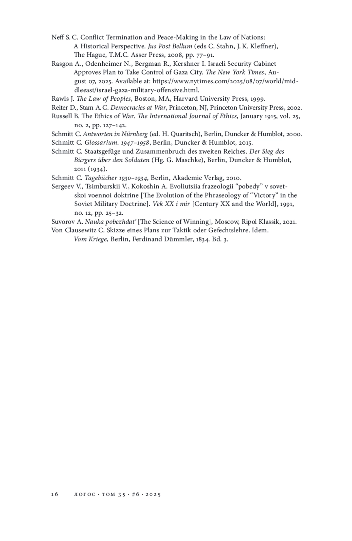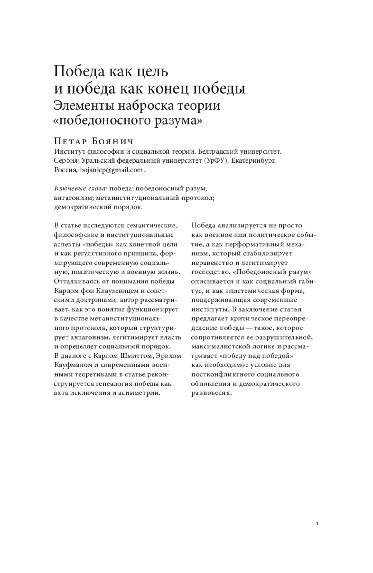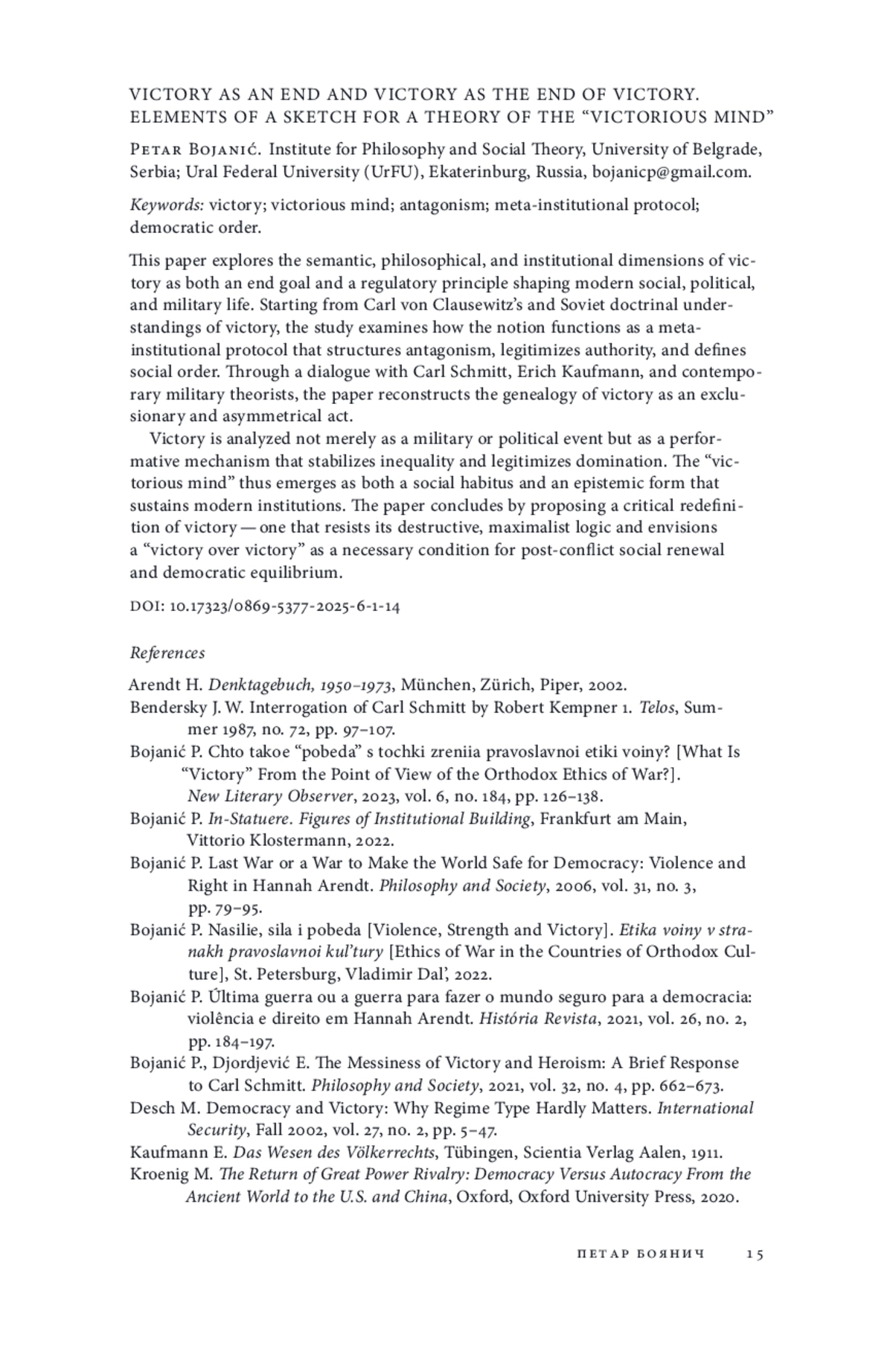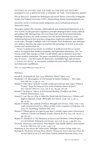 10. Bojanić P., Djordjević E. The Messiness of Victory and Heroism: A Brief Response to Carl Schmitt // Philosophy and Society. 2021. Vol. 32. № 4. P. 662-673.